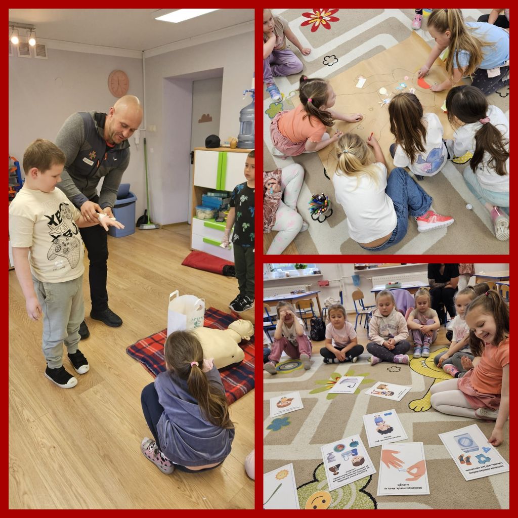 7 kwietnia w naszej grupie przedszkolnej obchodziliśmy Światowy Dzień Zdrowia, którego celem było uświadomienie dzieciom, jak istotne jest dbanie o zdrowie. Podczas zajęć plastycznych przedszkolaki miały okazję stworzyć kolorowy plakat Zdrowusia, promujący zdrowe nawyki i podstawową wiedzę na temat tego, jak dbać o zdrowie. Dzieci poznały i przypomniały sobie zasady higieny, takie jak mycie rąk, dbanie o czystość zębów, a także konieczność noszenia czystej bielizny. W ramach obchodów Dnia Zdrowia, w piątek, odbyło się spotkanie z ratownikiem górniczym, Panem Mariuszem Skupinem, podczas którego dzieci dowiedziały się, jak prawidłowo wykonać resuscytację krążeniową, jak opatrzyć ranę oraz czym jest pozycja boczna ustalona i w jakim celu układa się osobę w tej pozycji. Krok po kroku przedszkolaki zapoznały się z procedurami udzielania pierwszej pomocy, aby mogły zadbać o swoje bezpieczeństwo i pomóc poszkodowanym. Przypomniano także o numerze alarmowym 112 (1 usta, 1 nos i 2 oczu), który warto znać, by w razie potrzeby wezwać pomoc. Pamiętajmy, jak ważne jest nasze zdrowie i bezpieczeństwo!
