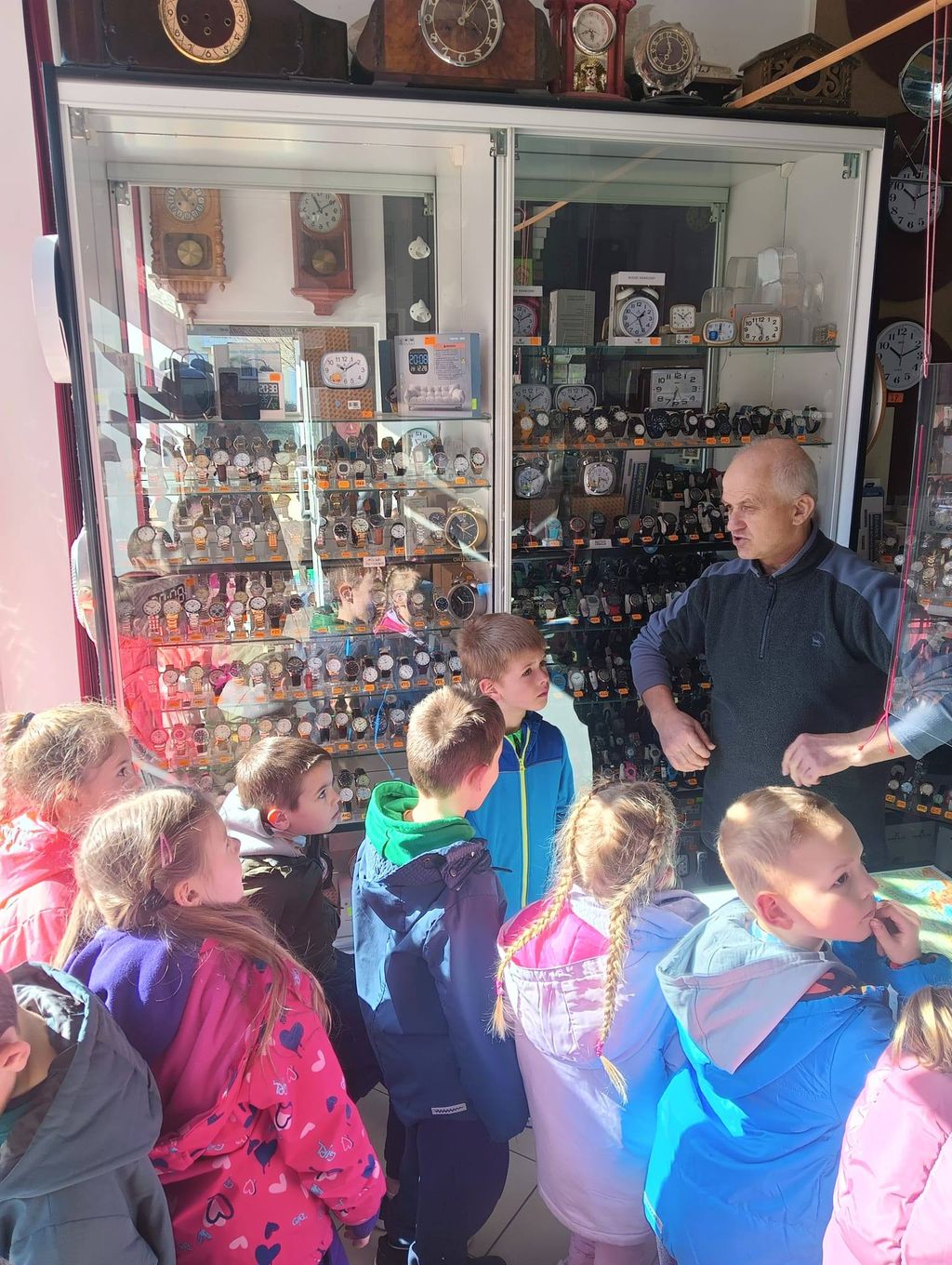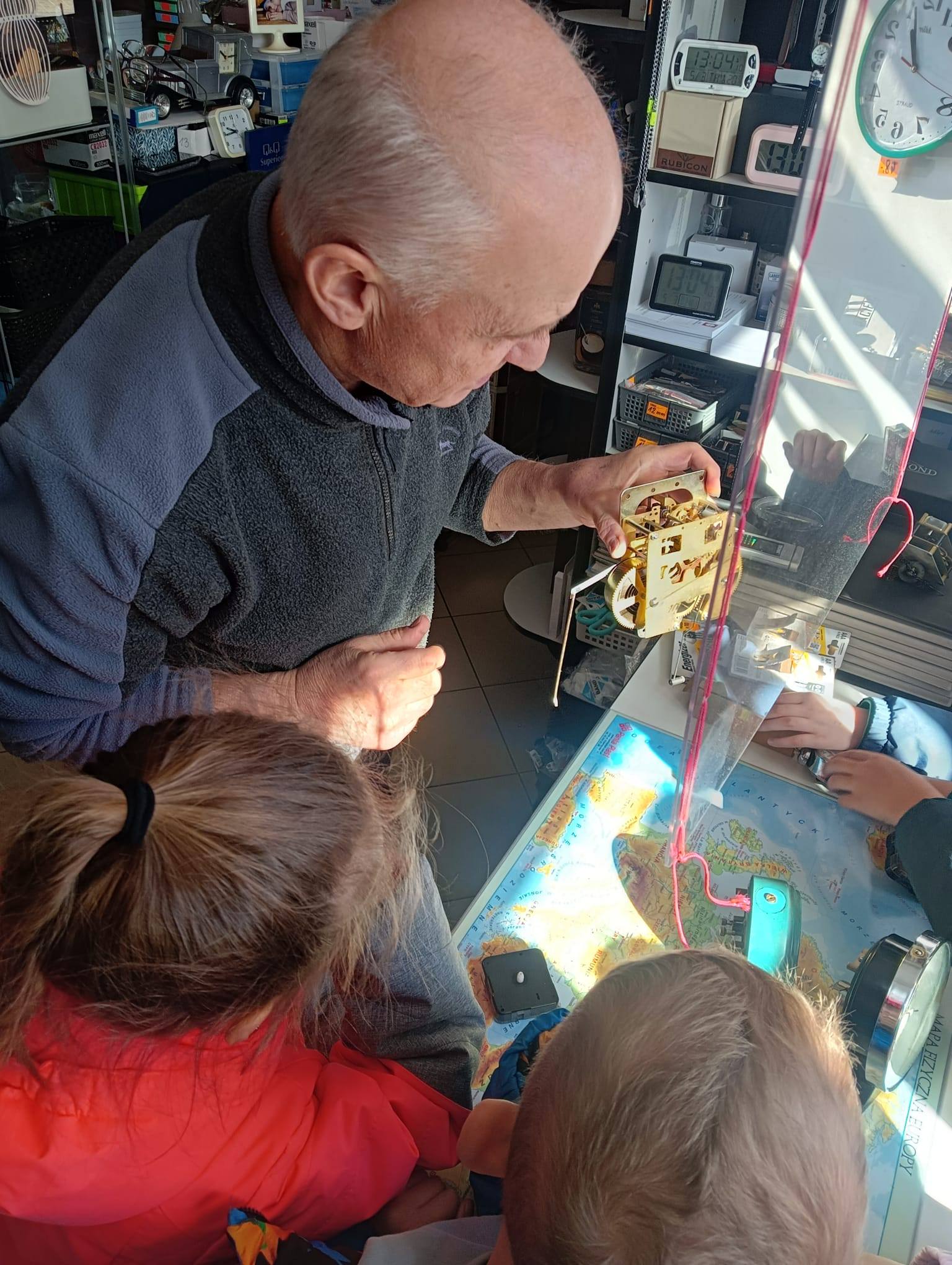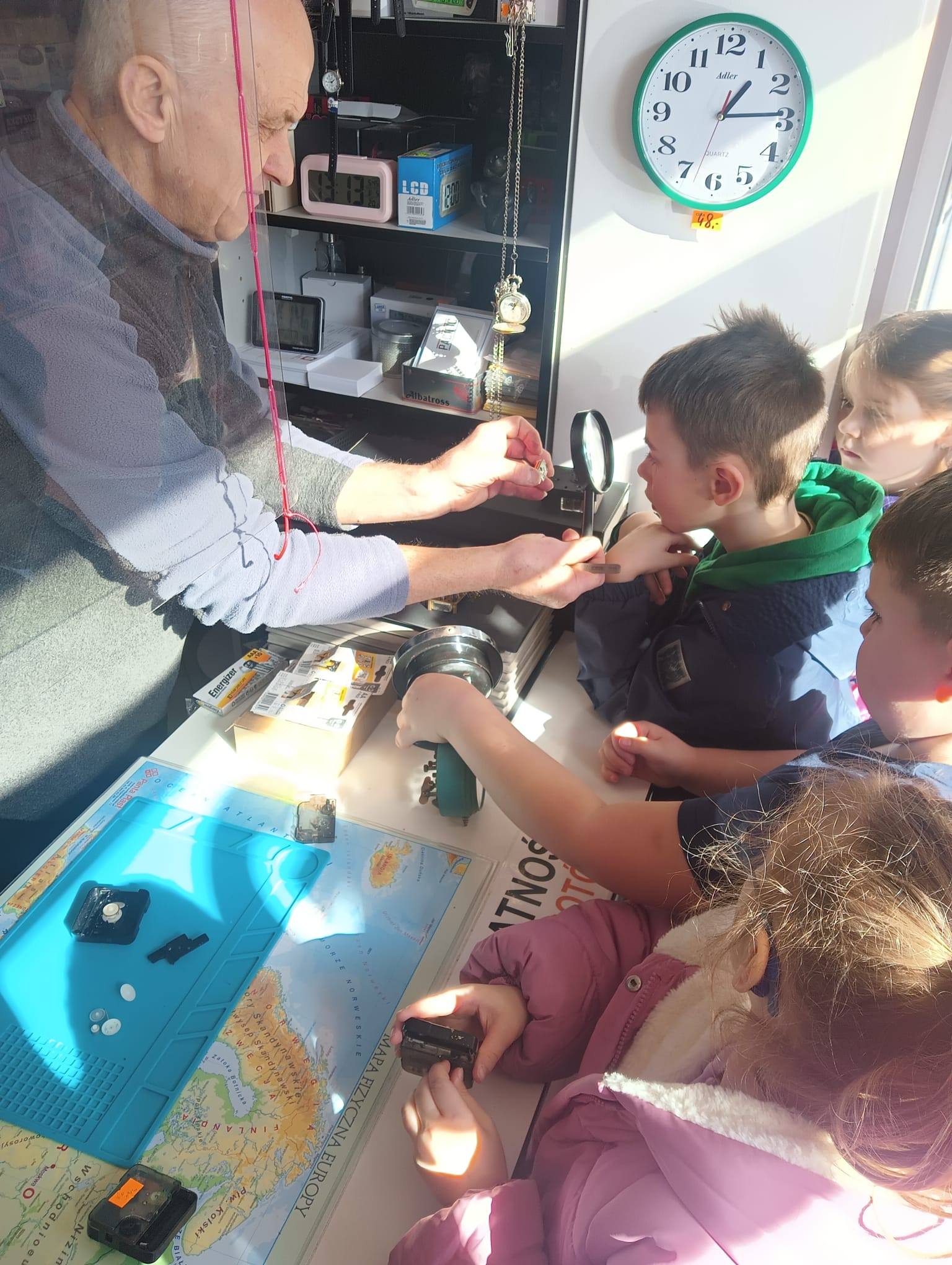 W tym tygodniu rozmawialiśmy o czasie! Dzieci poznały różne rodzaje zegarów oraz uczyły się odczytywać godziny. Podsumowaniem tygodnia była wizyta u zegarmistrza, który pokazał przedszkolakom, jak działają zegary i z czego zbudowane są niektóre zegarki. To była bardzo ciekawa i pouczająca wizyta, dzięki której dzieci mogły dowiedzieć się, jak ważny i interesujący jest zawód zegarmistrza. Dziękujemy za miłe przyjęcie i poświęcony czas!