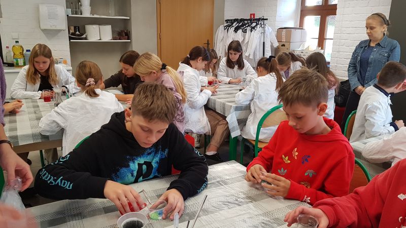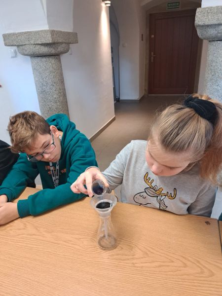 W Sudeckiej Zagrodzie Edukacyjnej uczniowie wzięli udział w warsztatach, w czasie których wykonywali samodzielnie doświadczenia. Dowiedzieli się czym są polimery, jak wykorzystując węgiel leczniczy oczyścić wodę oraz jak działają absorbenty. Każdy zabrał do domu kolorowy ciepły śnieg oraz polimerowe robaki.