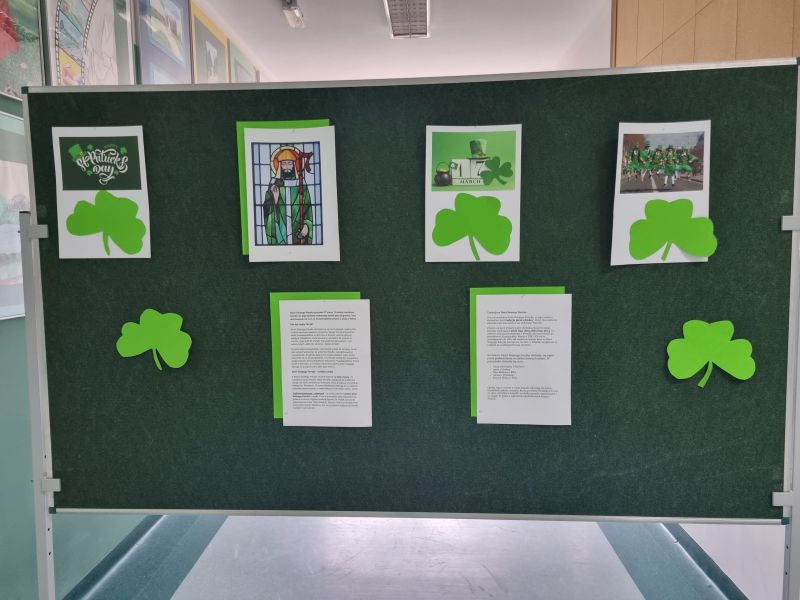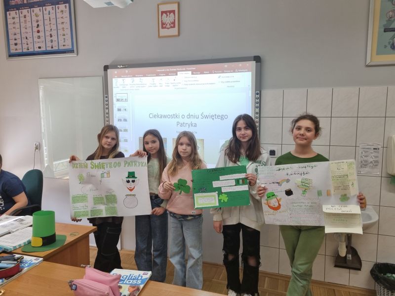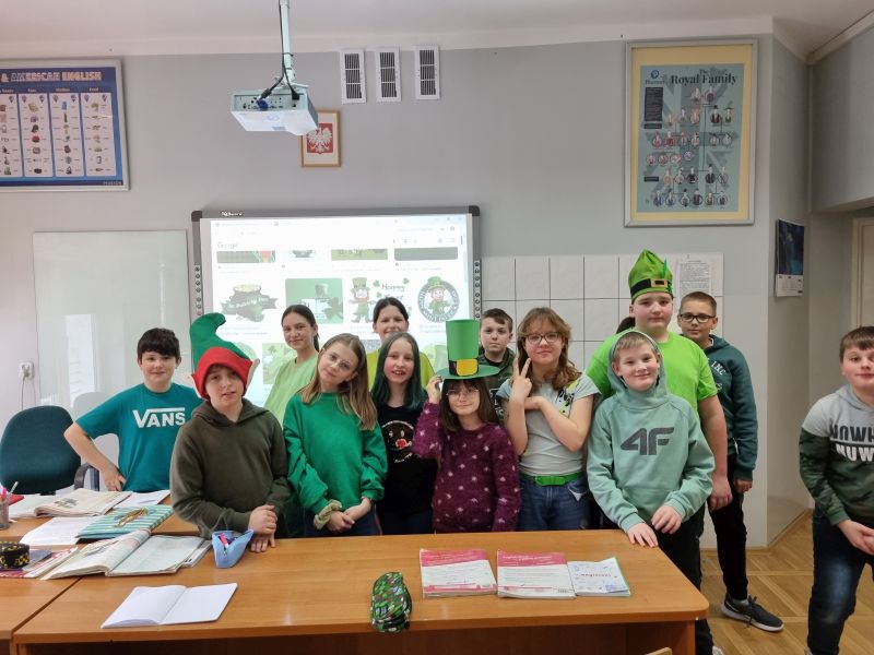 17 marca przypada dzień Św. Patryka – narodowe i religijne święto Irlandii. Dzięki hucznym i zielonym tradycjom znane i obchodzone jest na całym świecie. Uczniowie naszej szkoły przygotowali z tej okazji ciekawe prezentacje multimedialne, w których rozbrzmiewała muzyka irlandzka i można było obejrzeć oryginalny taniec irlandzki. Podczas zajęć języka angielskiego uczniowie mogli także sprawdzić swoją wiedzę na temat Irlandii oraz zwyczajów obchodzenia dnia Św. Patryka na świecie, rozwiązując quizy multimedialne. Sale oraz tablice zostały ozdobione zieloną koniczyną, zwaną shamrock. W tym dniu mile widziane były stroje w barwach zielonych.