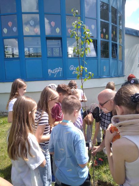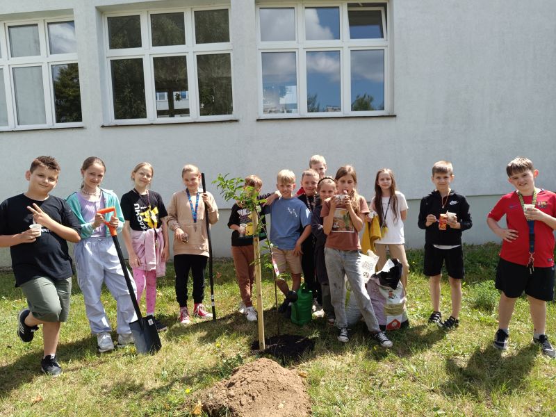 6 czerwca 2024 r. na szkolnych terenach zielonych przy ulicy Ociosowej, odbył się „Ekobieg dla Planety”, zrealizowany w ramach projektu „Dbamy o bioróżnorodność wokół nas”. Celem imprezy ekologicznej było zwrócenie uwagi, poprzez zabawę i integrację na bioróżnorodność najbliższego otoczenia ucznia i jej ochronę. Uczniowie z klasy 3A, 3B, 3C pod opieką starszych kolegów i koleżanek z klas 6 i 7, łącznie 70 osób, odwiedzali stanowiska zadaniowe i rozwiązywali różnorodne zadania, z wykorzystaniem opracowanej karty pracy. Dodatkowo uczestnicy zdobyli umiejętności praktyczne podczas nasadzania nowych gatunków drzew owocowych, w powstającym szkolnym sadzie, a tym samym szczególnie zadbali o wzbogacenie bioróżnorodności wokół szkoły. Za ukończenie „Ekobiegu dla Planety” i prawidłowo rozwiązaną kartę pracy, każdy uczestnik zabawy otrzymał nagrodę. Dziękujemy przedstawicielom klas 6 i 7 za integrację i wspaniałą opiekę nad młodszymi kolegami i koleżankami z klas 3.