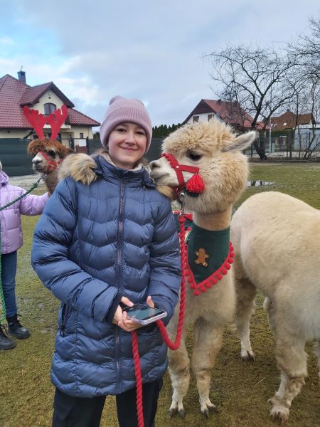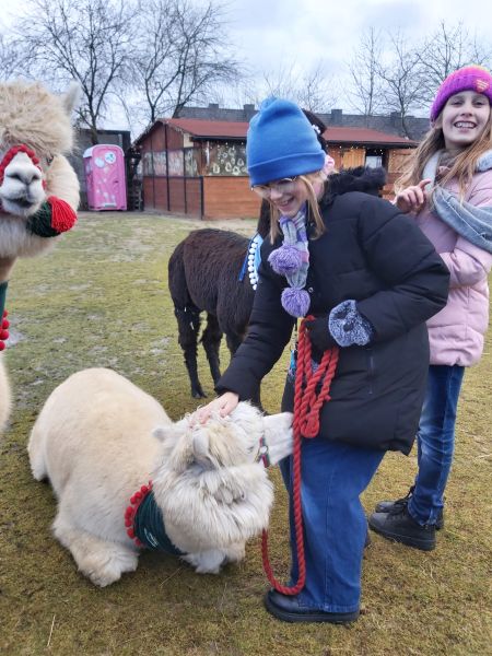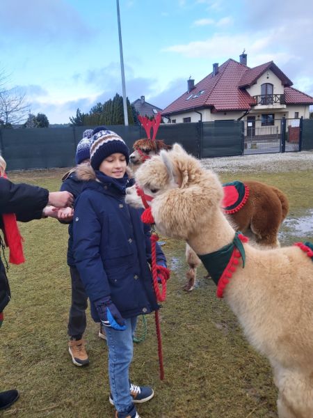 Klasa 4A wybrała się, 4 grudnia, na warsztaty mikołajkowo-świąteczne do Obory koło Lubina. Było zdobienie pierników i bombek, gry i zabawy, prezenty, ale najważniejsze było spotkanie z alpakami. Pani z „PleciAnki” opowiedziała o hodowli i zwyczajach alpak. A następnie każdy mógł pospacerować z alpaką, pogłaskać ją, przytulić i nakarmić smakowitą marchewką.