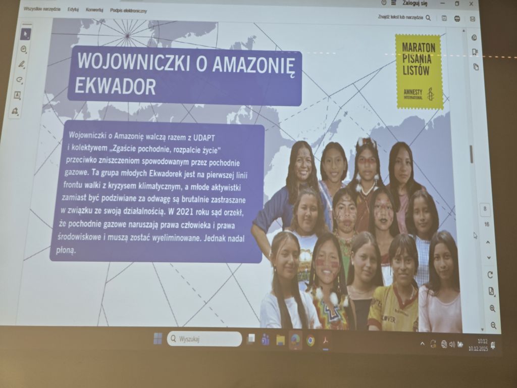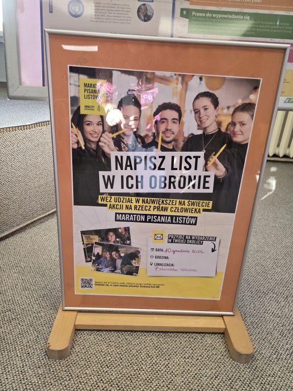W tym roku po raz pierwszy dołączyliśmy do ogólnoświatowej inicjatywy Amnesty International, która co roku zachęca ludzi na wszystkich kontynentach do stawania w obronie praw człowieka. Kampania Write for Rights 2025 skupiała się na wsparciu osób doświadczających niesprawiedliwości, prześladowań oraz naruszeń podstawowych wolności. Jej przesłaniem było pokazanie, że nawet pojedynczy list potrafi stać się realnym gestem solidarności i impulsem do zmian. 10 grudnia wszyscy ósmoklasiści na lekcjach wos-u przygotowali listy. Dzięki pomocy biblioteki i pani E. Turbińskiej zostały one sprawdzone, następnie przepisane przez uczniów i wysłane do odpowiednich ambasad. To ogromny wkład w globalną akcję i realna pomoc dla osób, które jej potrzebują. Tegoroczne działania Amnesty objęły m.in. obrońców środowiska i społeczności rdzennych, osoby walczące o wolność słowa oraz ludzi dotkniętych skutkami kryzysu klimatycznego. Dziękujemy wszystkim za zaangażowanie, empatię i chęć działania. Razem naprawdę możemy więcej!