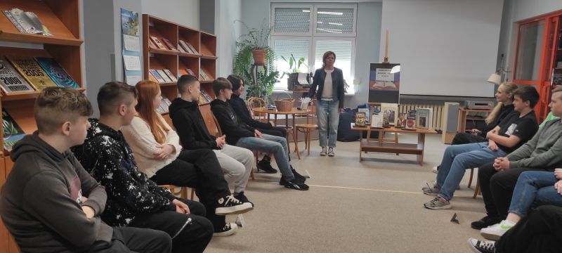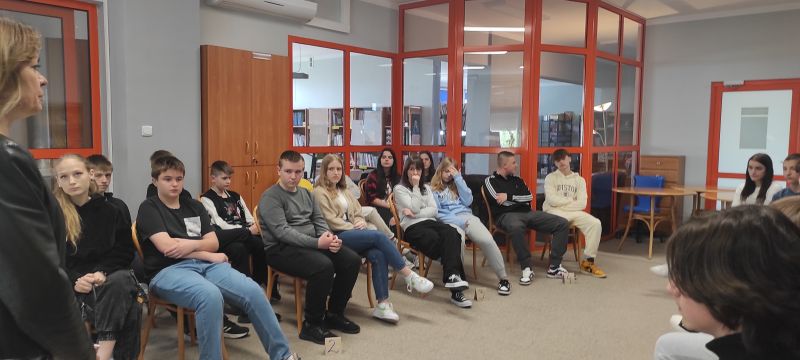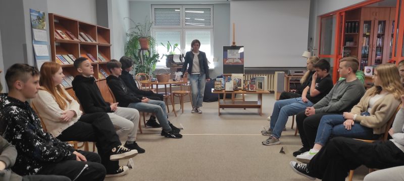 W maju zaprosiłyśmy do biblioteki szkolnej wszystkich uczniów klas 8. Wspólnie przypominaliśmy bohaterów literackich i wydarzenia z lektur, a także analizowaliśmy motywy literackie.
