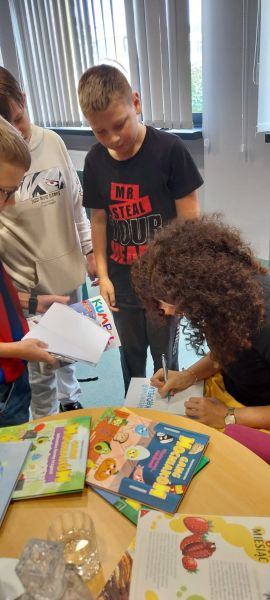 Piątoklasiści mieli również okazję zadać pytania dotyczące twórczości i poglądów Pani Pauliny na życie. W czasie spotkania uczniowie zobaczyli dużo książek autorki. Niektórzy nawet zakupili jej publikacje, otrzymując autograf.
