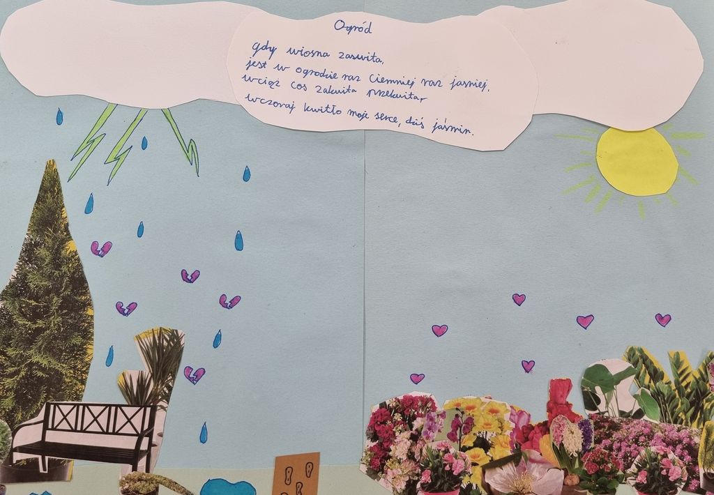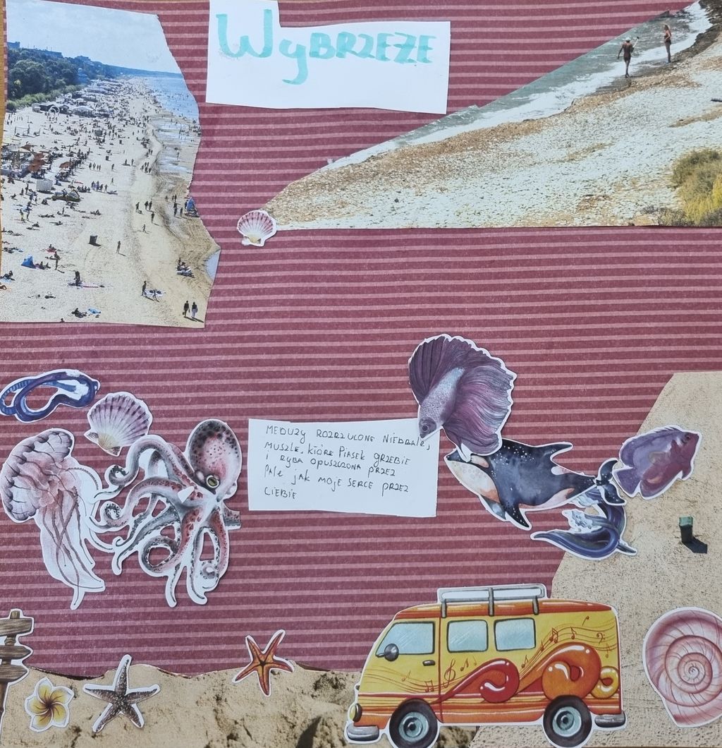 W bibliotece uczniowie przeczytali wiele wierszy poetki i podjęli próbę ich interpretacji. Wysłuchali również piosenki Sanah „Pocałunki”, której tekst oparty jest na utworach z tomiku o tym samym tytule. Następnie sami układali wiersze i nadawali im tytuły. Na lekcjach plastyki każdy uczeń wykonał kolaż do wybranego przez siebie wiersza. Prezentujemy kilka z nich.