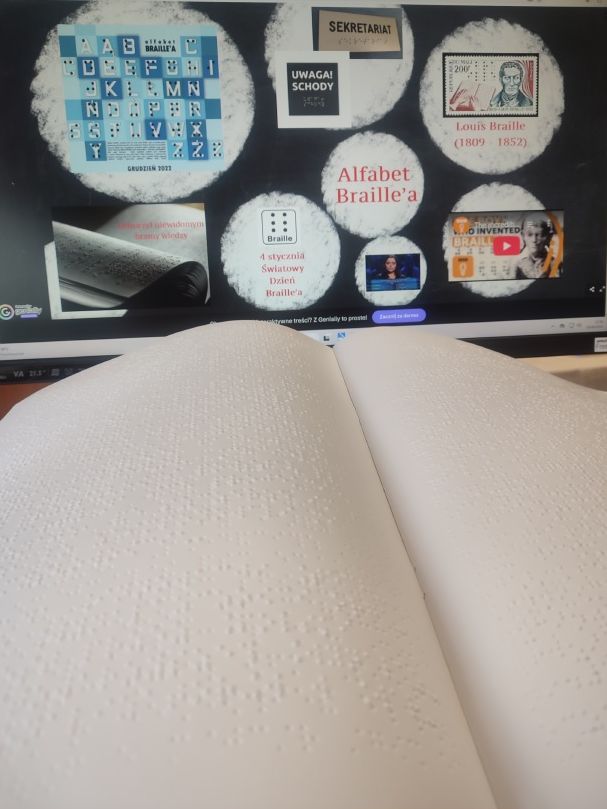 Z okazji Dnia Kropki w bibliotece szkolnej zostały zorganizowane kreatywne zajęcia biblioteczne dla klas 6 pt.: "Od kropki do alfabetu Braille’a". Alfabet stworzony w XIX wieku to system kropek, który otworzył niewidomym bramy wiedzy. Celem spotkania było zapoznanie z historią i zasadami działania alfabetu Braille’a oraz kształtowanie postaw empatii i zrozumienia wobec osób z niepełnosprawnością wzroku. Zadaniem uczestników było odkodowanie cytatów o kreatywności i stworzenie swojej wizytówki w tym alfabecie kropkowym. Uczniowie mieli okazję zapoznać się z książkami w Braille’u, które znajdują się w naszym szkolnym księgozbiorze.
