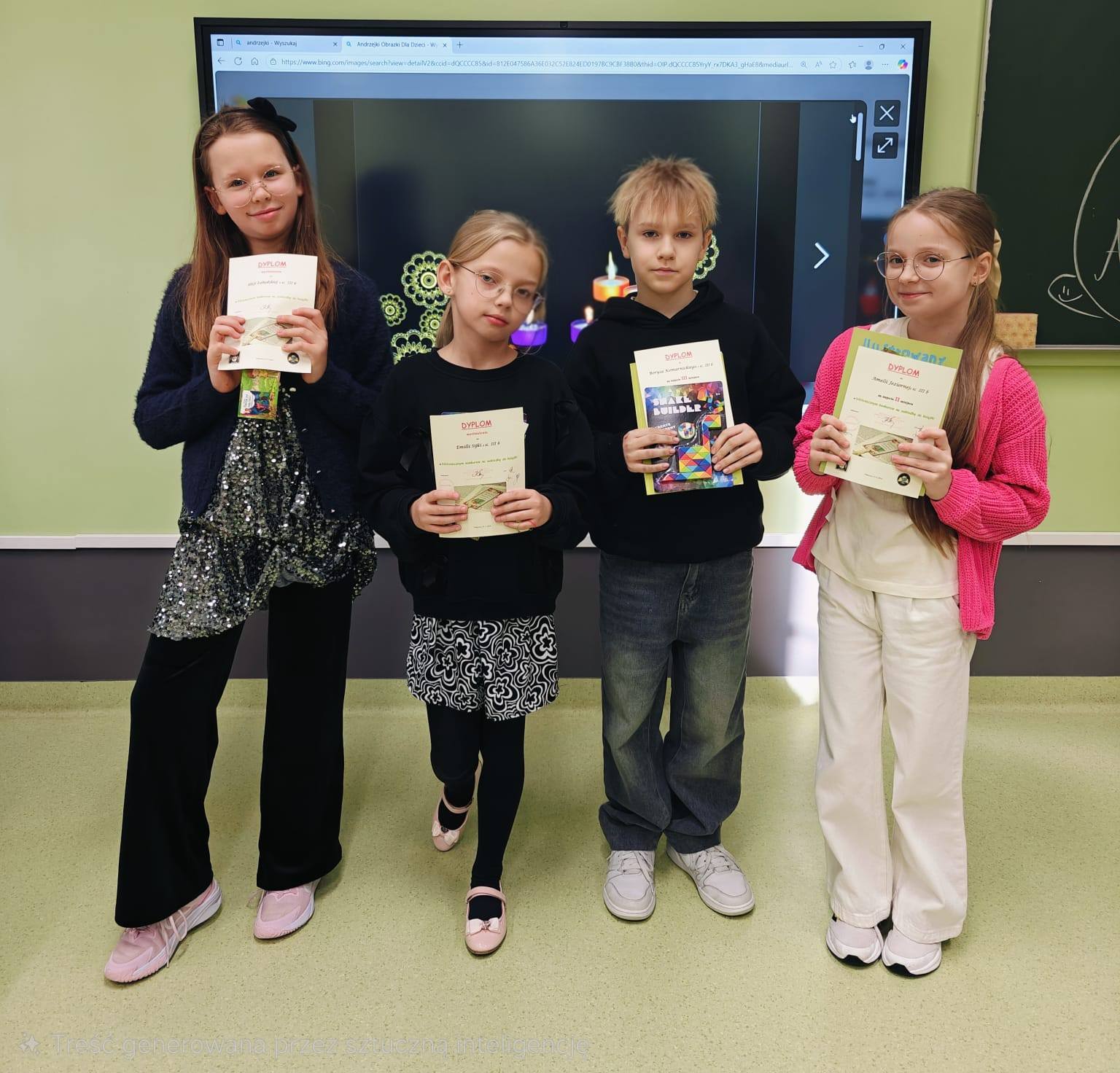 Wyróżnienia - Tola Hendziak z kl. 1a, Colin Marczyk z kl. 1a, Iga Szerszenowicz z kl. 1b , Alicja Jasińska z kl. 1b, Lena Suchora z kl. 1b, Adam Nieora z kl. 1b, Maria Karsznia z kl.1c , Amelia Kowal z kl. 1c , Hanna Żelezik z kl.1d