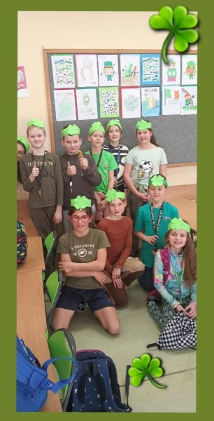 P. Agnieszka Knihnicka - nauczycielka j. angielskiego, wprowadziła elementy kultury irlandzkiej, takie jak: zielony kolor, koniczynki, czy garnek złota, a wszystko to w formie gier, legend oraz quizu o Irlandii. Dzieci uczyły się w języku angielskim prostych zwrotów, związanych ze świętem, a także wykonały proste prace plastyczne, związane z tematyką. Lekcje angielskiego były świetną okazją do zabawy i jednocześnie nauki języka angielskiego poprzez świąteczny kontekst.