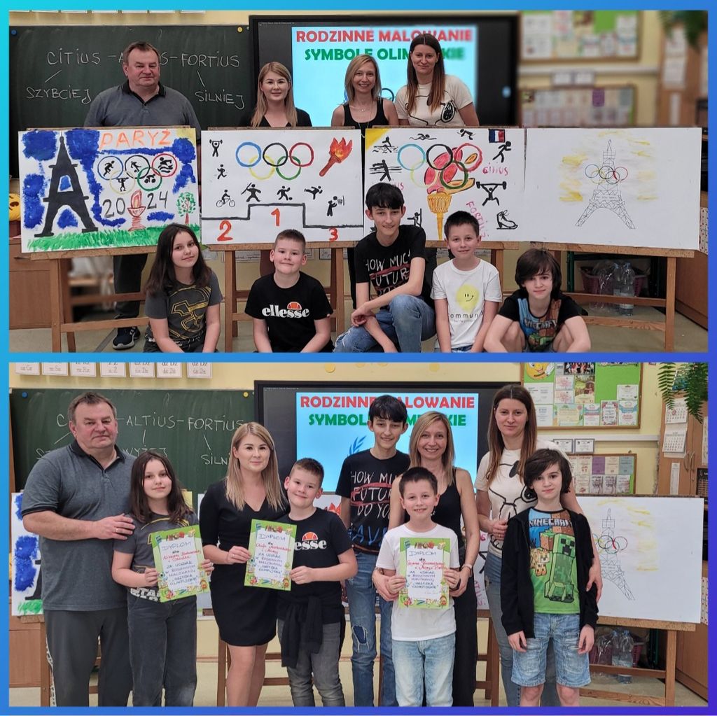 W kwietniu, uczniowie klas trzecich, wraz ze swoimi bliskimi, przybyli do szkoły, aby wziąć udział w kolejnej edycji "Rodzinnego Malowania". Tym razem tematyka dotyczyła symboli olimpijskich. Każda grupa wykazała się kreatywnością i ogromnym talentem. Powstały piękne prace, które przyozdobiły nasz szkolny korytarz. Serdecznie dziękujemy wszystkim uczestnikom za poświęcony czas, chęci i wspaniałą, owocną pracę.