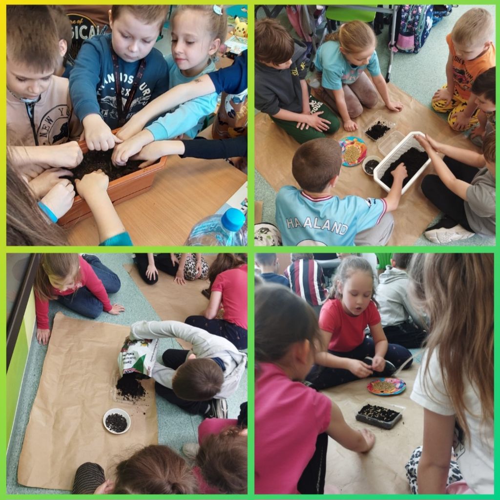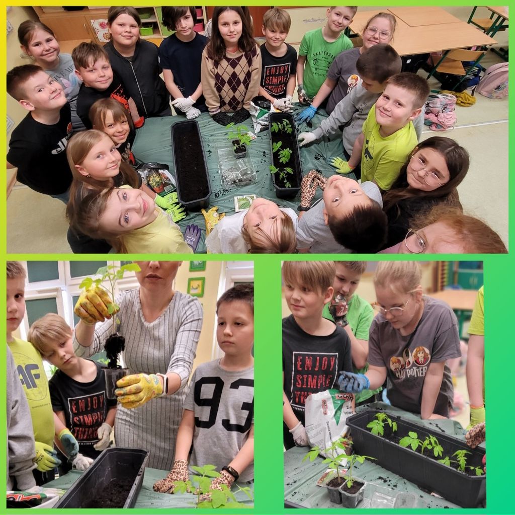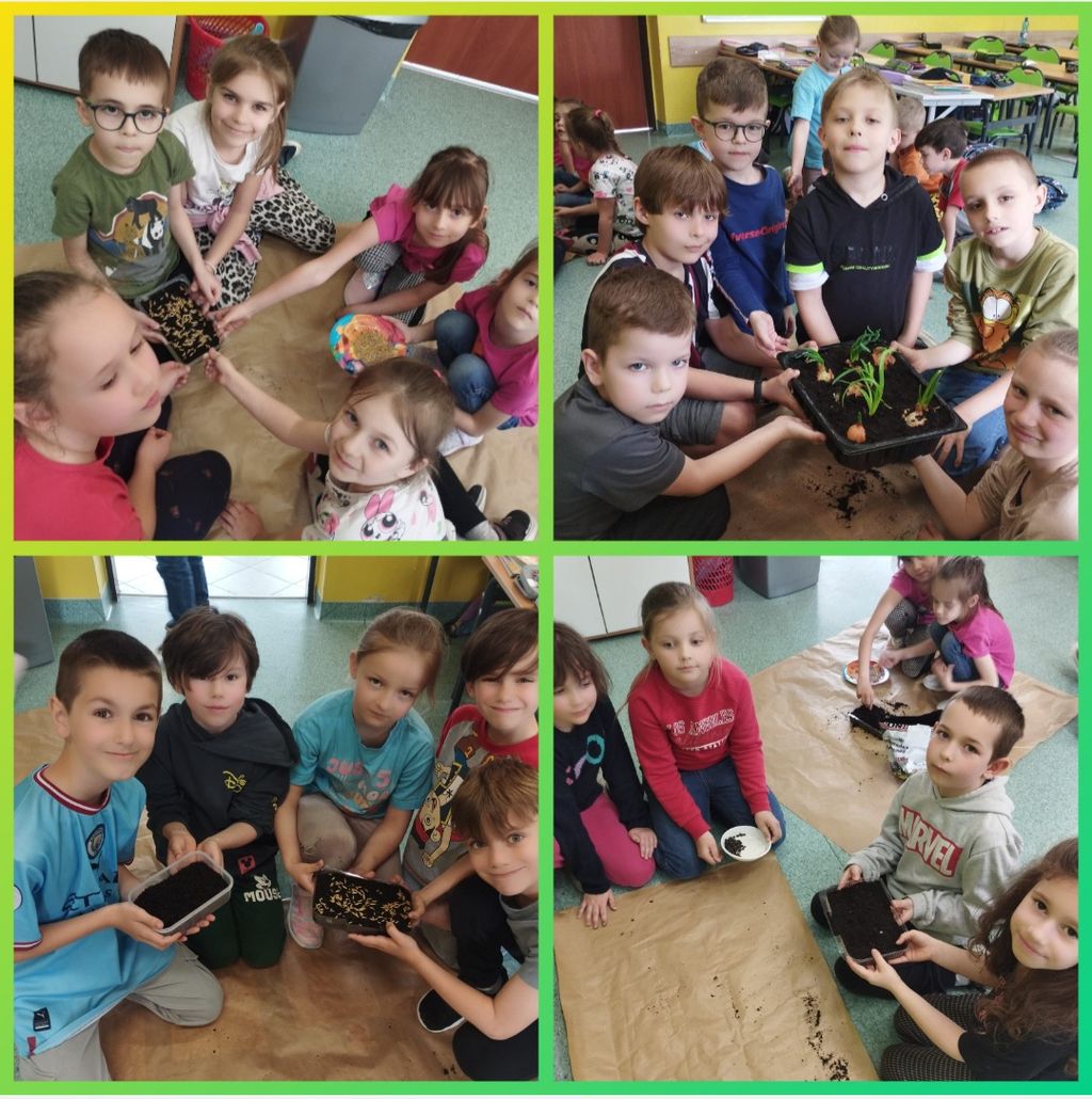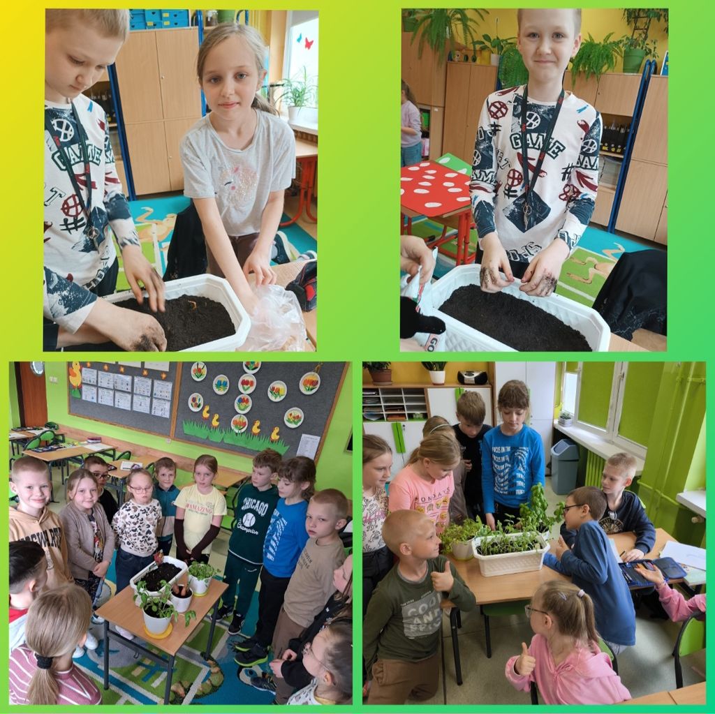 W kwietniu wszyscy uczniowie klas 1 - 3 zamienili się w ogrodników. Wspólnymi siłami posadzili przeróżne sadzonki oraz wysiali rozmaite nasionka. Teraz, z ogromną radością i wielkim zaangażowaniem, podlewają klasowe ogródki i obserwują wzrost roślinek.