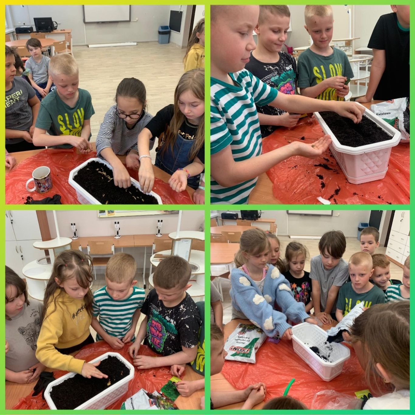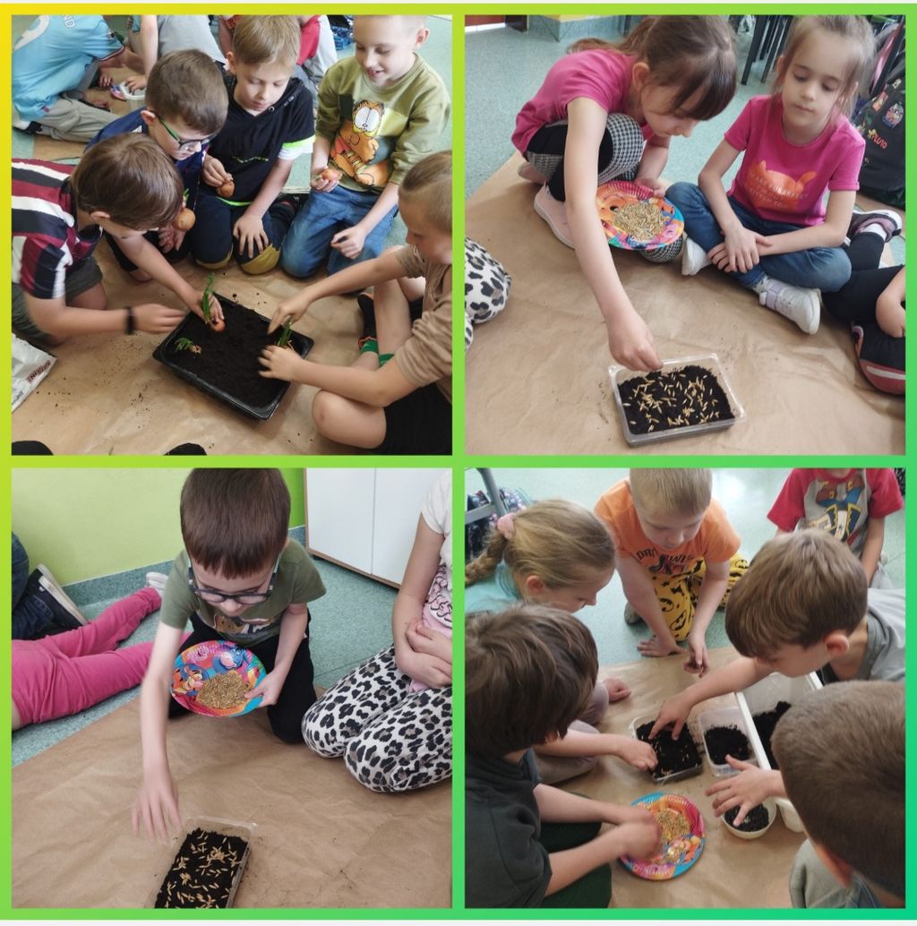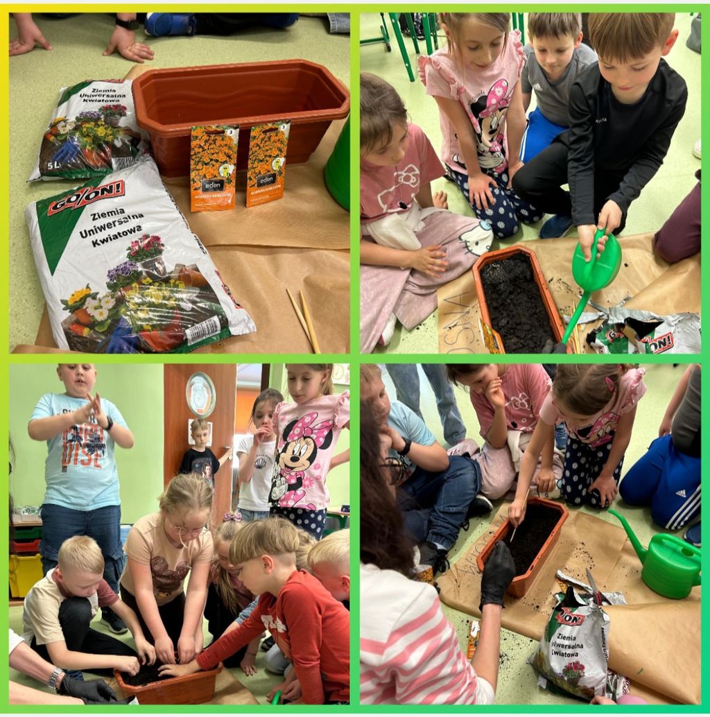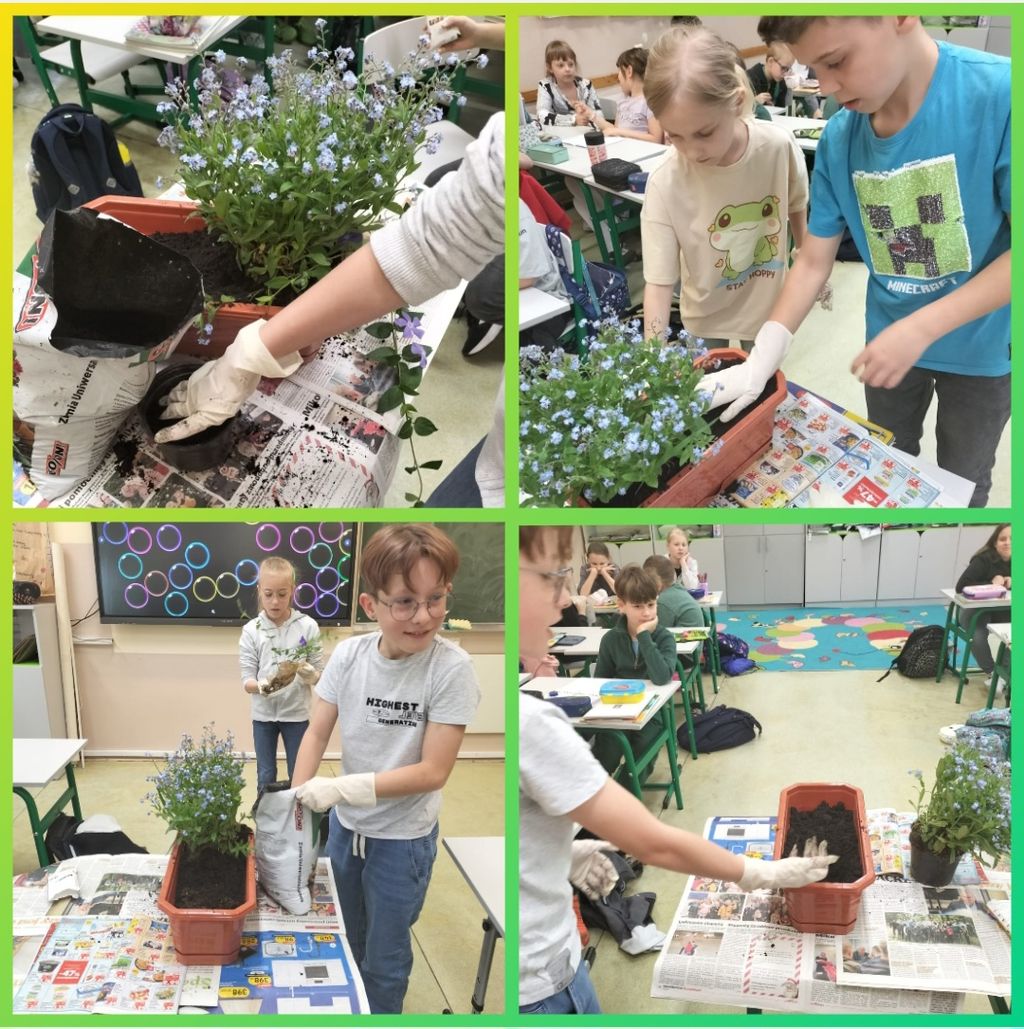 W kwietniu wszyscy uczniowie klas 1 - 3 zamienili się w ogrodników. Wspólnymi siłami posadzili przeróżne sadzonki oraz wysiali rozmaite nasionka. Teraz, z ogromną radością i wielkim zaangażowaniem, podlewają klasowe ogródki i obserwują wzrost roślinek.