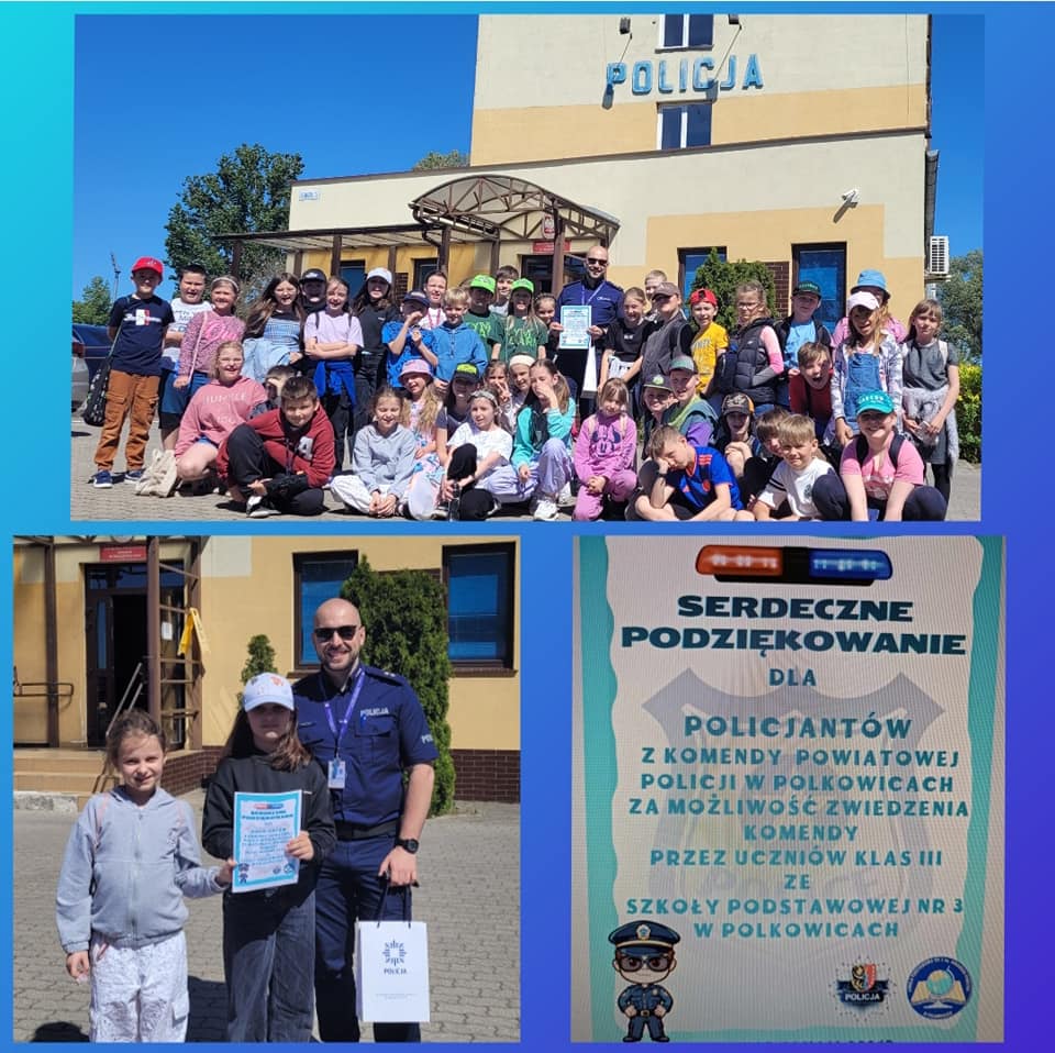 14 maja, wszystkie klasy trzecie wybrały się na wycieczkę do Komendy Powiatowej Policji w Polkowicach. Uczniowie poznali bliżej zawód policjanta, mieli okazję wejść do radiowozu, zobaczyć z bliska policyjny motocykl, a także poznać dwa policyjne psy. Ogromne zaciekawienie wzbudziła wizyta w wydziale daktyloskopii, gdzie każde chętne dziecko mogło mieć zdjęte odciski swoich palców, z czego zdecydowana większość skorzystała. Nie zabrakło również rozmowy na temat bezpieczeństwa, zarówno w życiu codziennym, jak i podczas zbliżających się wakacji.