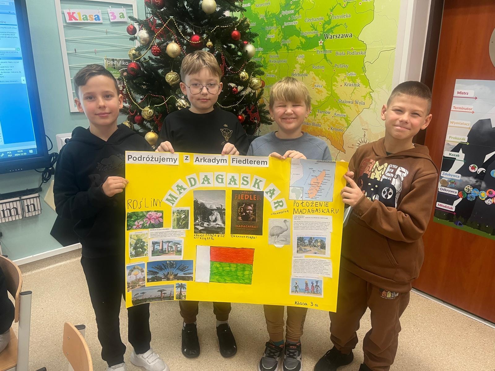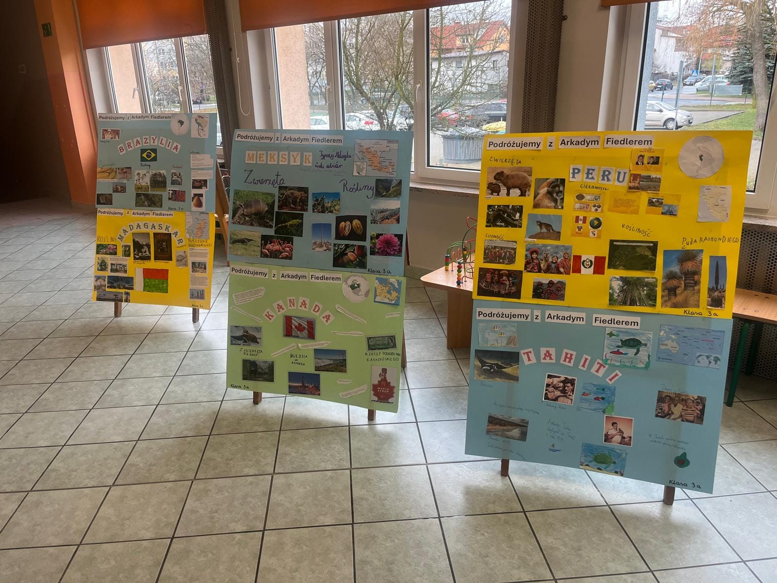 Na przełomie listopada i grudnia uczniowie klas trzecich realizowali projekt „Podróżujemy z Arkady Fiedlerem”. Dzieci poszukiwały i gromadziły informacje na temat patrona naszej szkoły, jego podróży oraz twórczości literackiej. Efektem wytężonej pracy uczniów są prezentacje multimedialne o Arkadym Fiedlerze oraz plakaty prezentujące wybrane miejsca, które odwiedził nasz patron.