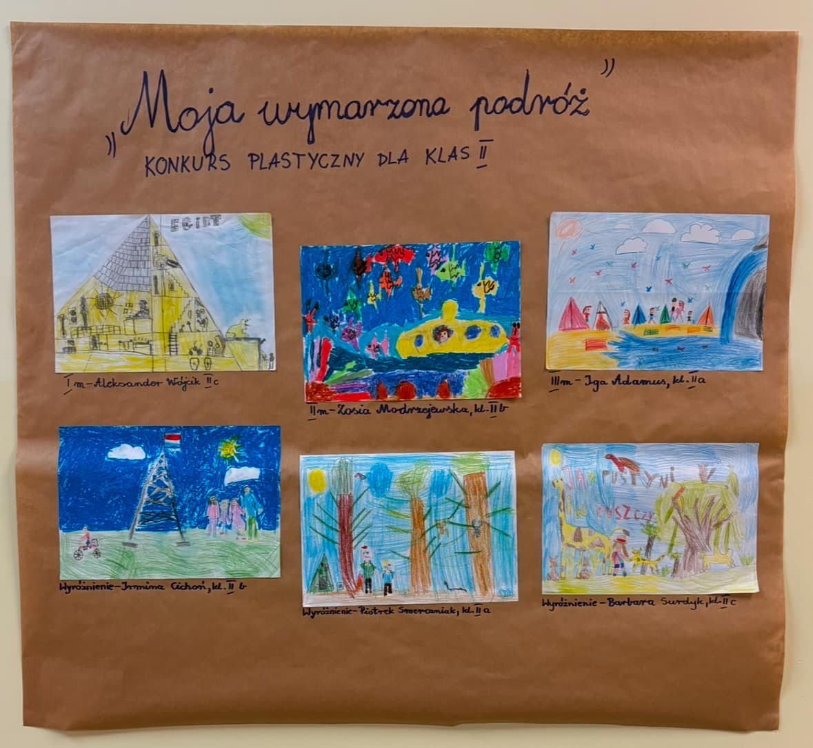 Na początku grudnia odbył się konkurs plastyczny dla uczniów klas drugich p.n. „Moja wymarzona podróż". Uczestnicy konkursu w swoich pracach pokazali, że marzą o podróżach w bliskie i dalekie części świata, o podróżach podniebnych i w głębiny oceanu, a także na inne planety. Jury miało trudne zadanie w wyborze najciekawszych prac, bo mali artyści wykazali się dużą pomysłowością. Po długich debatach nagrodzono sześcioro dzieci: