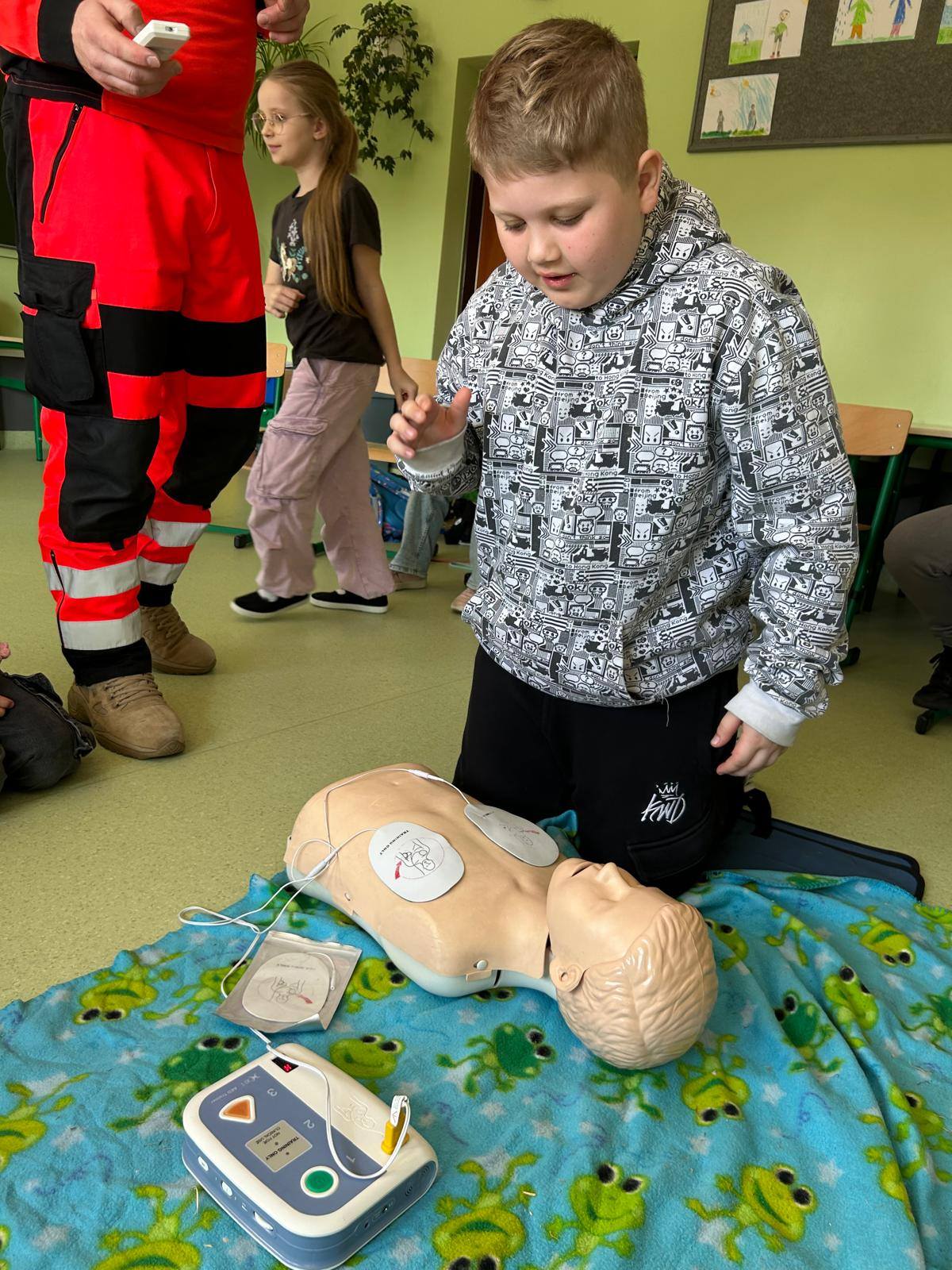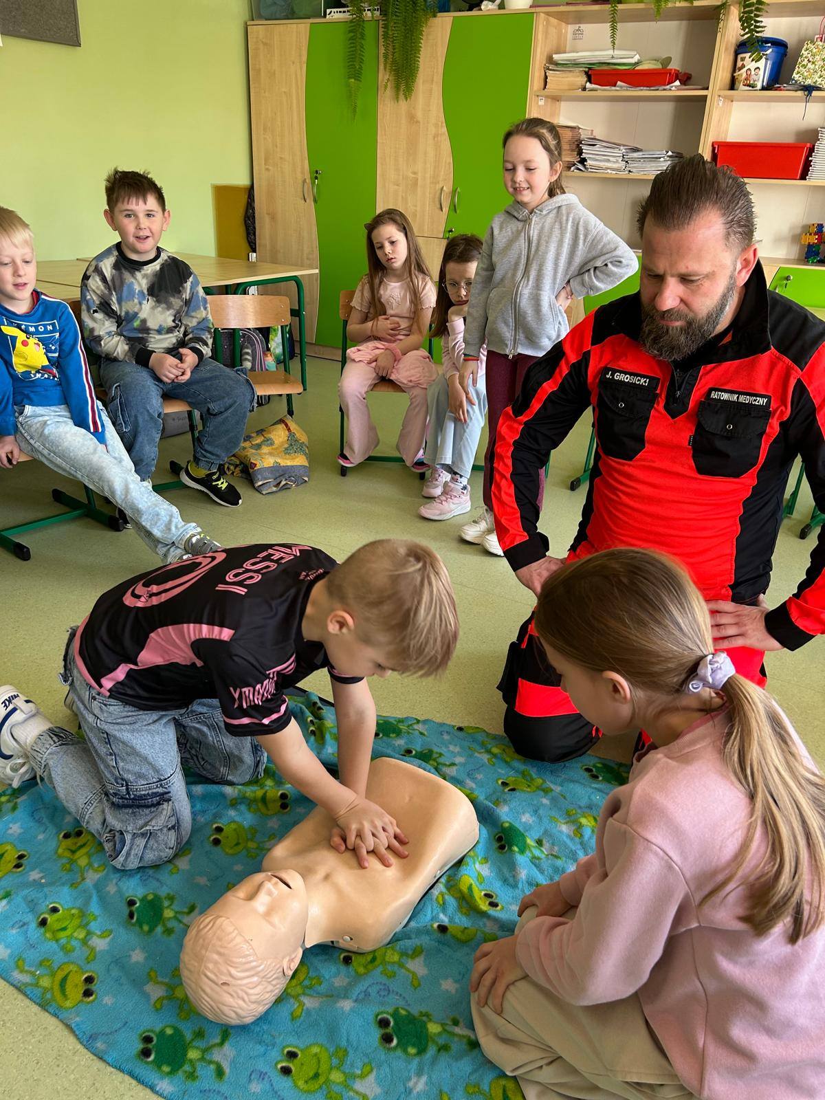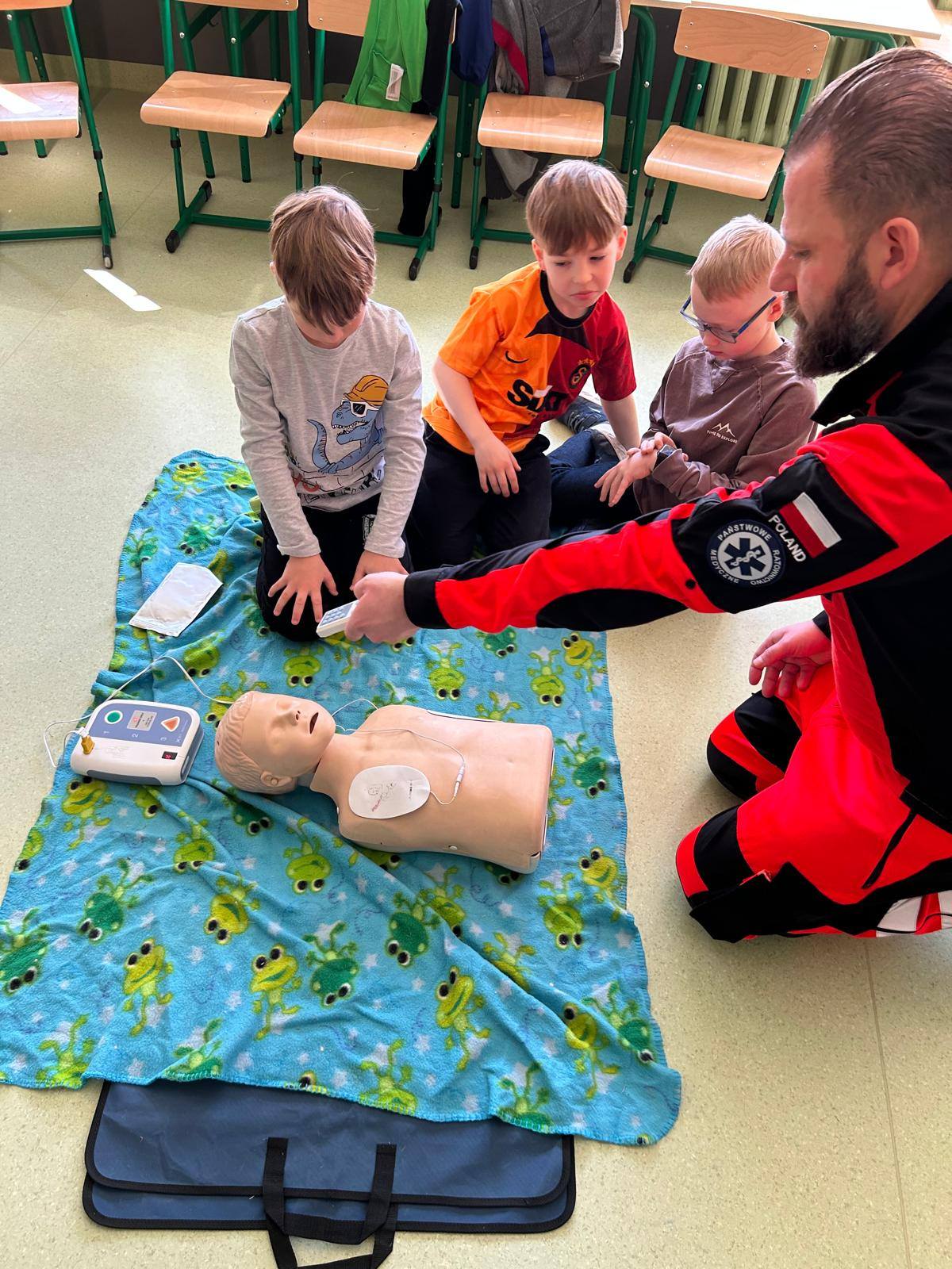 28 marca uczniowie klasy 2b gościli na lekcjach pana Jakuba Grosickiego - ratownika medycznego z Polkowickiego Pogotowia Ratunkowego. Pan ratownik przeprowadził dla uczniów zajęcia z udzielania pierwszej pomocy przedmedycznej. Dzieci ćwiczyły, jak prawidłowo wezwać pomoc pod numerem 112 lub 999. Na fantomie trenowały jeden z elementów resuscytacji - uciski klatki piersiowej. Pod okiem pana ratownika ćwiczyli też ułożenie poszkodowanego w tzw. pozycji bezpiecznej oraz jak prawidłowego użycia defibrylatora AED. Przeprowadzone zajęcia bardzo zainteresowały drugoklasistów. Dzięki nim zdobyli cenne, praktyczne umiejętności. Uczniowie, wraz z wychowawcą, panią Moniką Mitką, dziękują panu Jakubowi Grosickiemu za przyjęcie zaproszenia na lekcje i przeprowadzenie ciekawych, praktycznych zajęć.