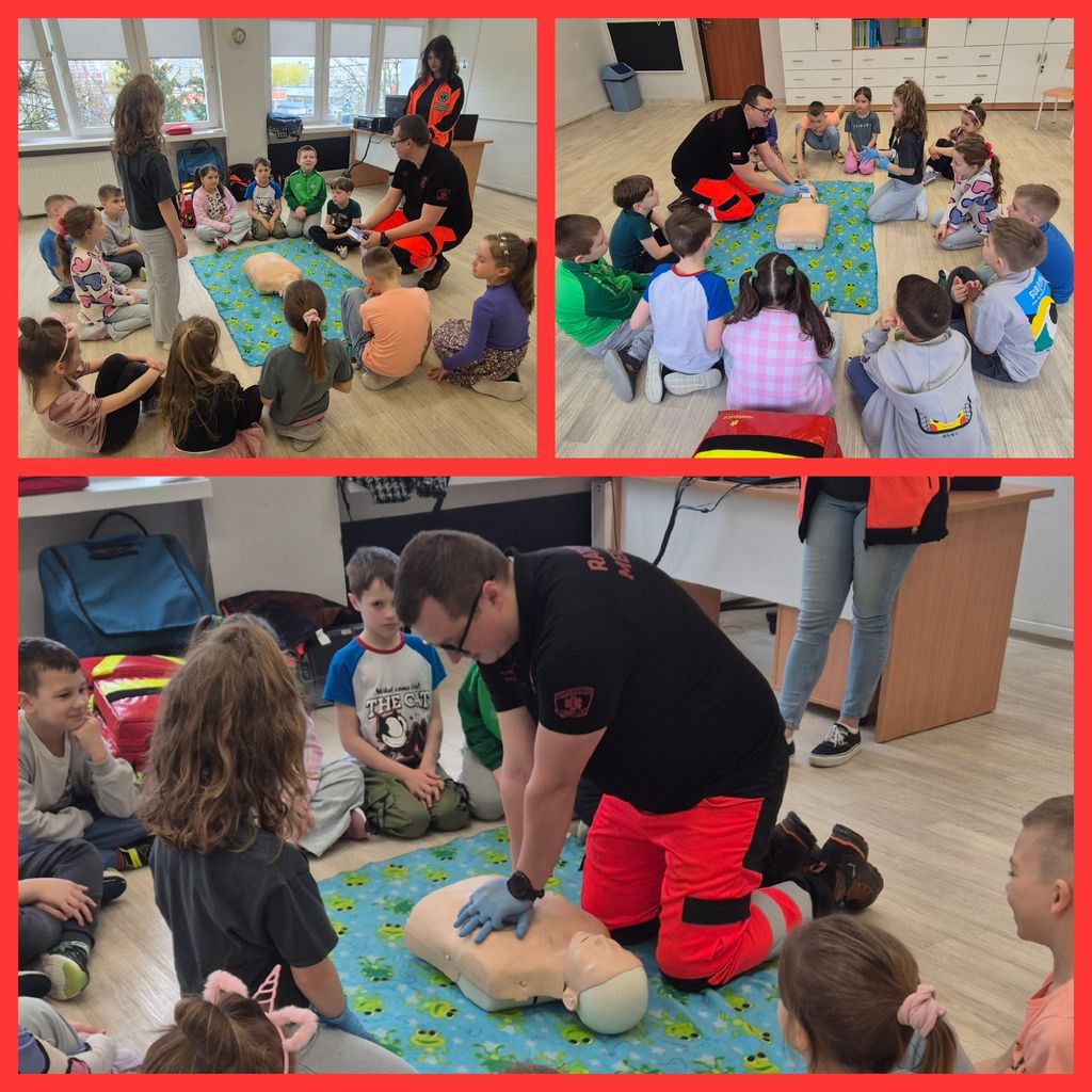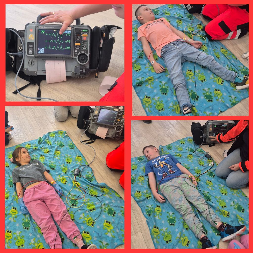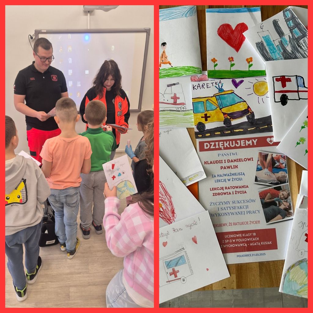 31 marca uczniowie klasy 1b gościli na lekcjach Państwa Klaudię i Daniela Pawlik - ratowników medycznych z Polkowickiego Pogotowia Ratunkowego i SOR-u Głogowskiego Szpitala Powiatowego. Ratownicy przeprowadzili dla uczniów zajęcia z udzielania pierwszej pomocy przedmedycznej. Dzieci poznały Algorytm Pierwszej Pomocy oraz Łańcuch Przeżycia, a także przypomniały sobie oraz utrwaliły numery alarmowe 112 i 999. Na fantomie trenowały kolejność działań w przypadku konieczności udzielenia pierwszej pomocy oraz resuscytację, czyli uciski klatki piersiowej. Poznały także zastosowanie defibrylatora AED. Duże wrażenie zrobiła na dzieciach ogromna apteczka, czyli plecak ratunkowy i wszystkie znajdujące się w nim leki i sprzęty. Największą atrakcją okazał się aparat do badania EKG i możliwość zbadania się. Wszyscy ochoczo dali się podłączyć do kabelków i obserwowali, jak bije ich serce. Przeprowadzone zajęcia były niesamowicie interesujące, wzbudzające moc wielkich emocji, a przede wszystkim wypełnione ogromem niezbędnej wiedzy i umiejętności. Uczniowie, wraz z wychowawcą, panią Agatą Kusiak, dziękują Pani Klaudii i Panu Danielowi za wspaniale i owocnie spędzony czas. I za to, że ratują ludzkie zdrowie i życie!