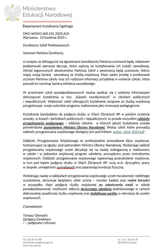 Zapraszamy do zapoznania się z listem Departamentu Kształcenia Ogólnego Ministerstwa Edukacji Narodowej.