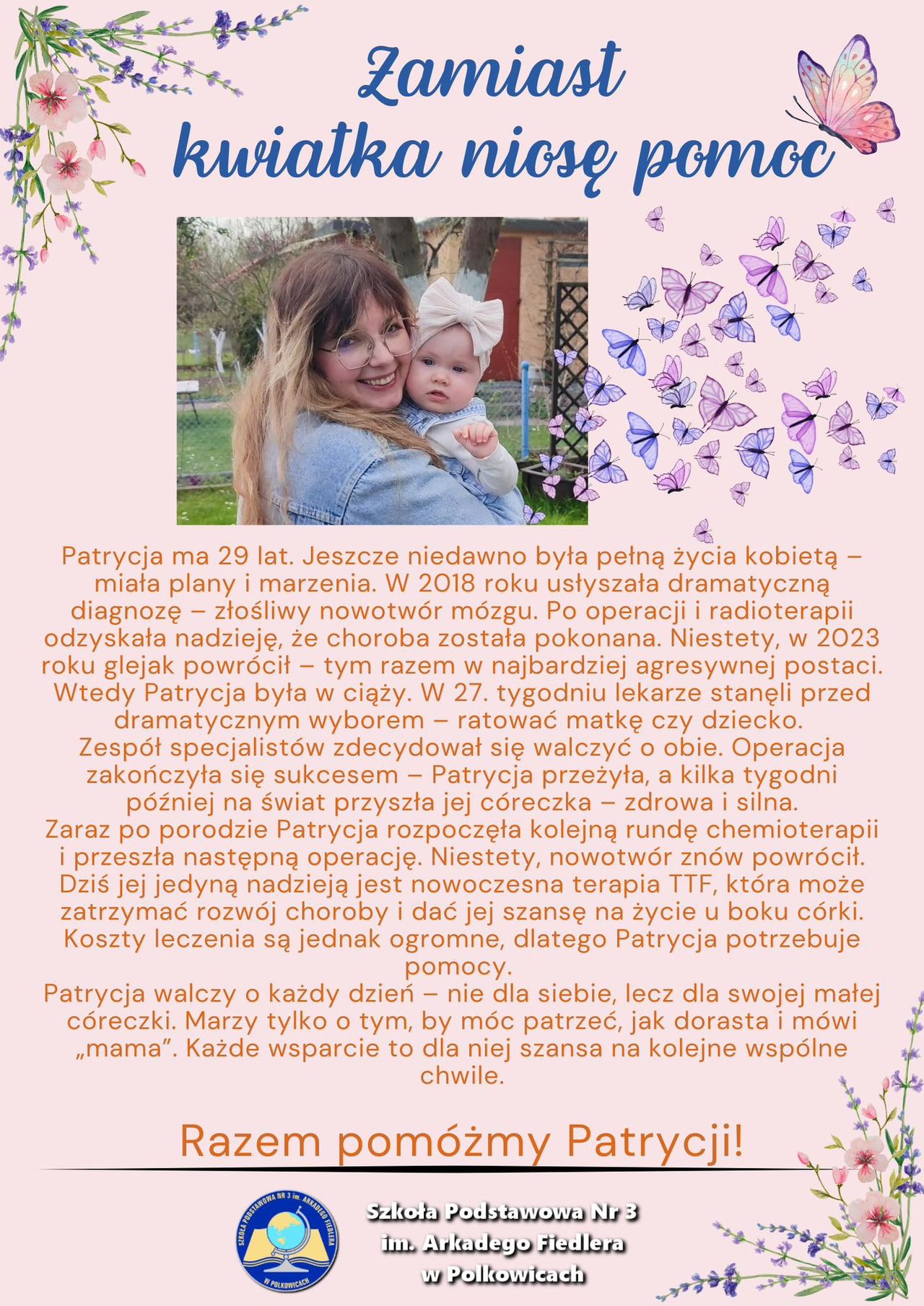 Już w przyszłym tygodniu będziemy uroczyście świętować z całą społecznością „Trójki” Dzień Edukacji Narodowej. Jesteśmy niezmiernie wdzięczni, że co roku otrzymujemy od Was wyrazy ogromnej sympatii i wdzięczności, miłe słowa oraz mnóstwo uśmiechu. Akcja charytatywna pn. „Zamiast kwiatka niosę pomoc”, w którą corocznie włączają się nauczyciele i pracownicy „Trójki”, stała się już naszą piękną tradycją. Prosimy także Państwa o przyłączenie się do tej akcji w postaci drobnych datków — zamiast kwiatka czy „słodkości”. Tym małym gestem wspomożemy Patrycję Figurską. Od poniedziałku 13.10.2025 r. do piątku 17.10.2025 r. w obu budynkach szkoły, obok plakatu „Zamiast kwiatka niosę pomoc”, będzie stała puszka na datki.