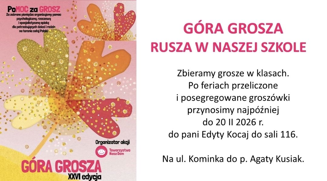 sobota, 29 listopada 2025 KOLEJNA EDYCJA "GÓRY GROSZA" RUSZA W NASZEJ SZKOLE! Zapraszamy do licznego udziału. Ziarnko do ziarnka, aż zbierze się miarka! Drukuj red. sp3_agata_kusiak Następny wpis Poprzedni wpis