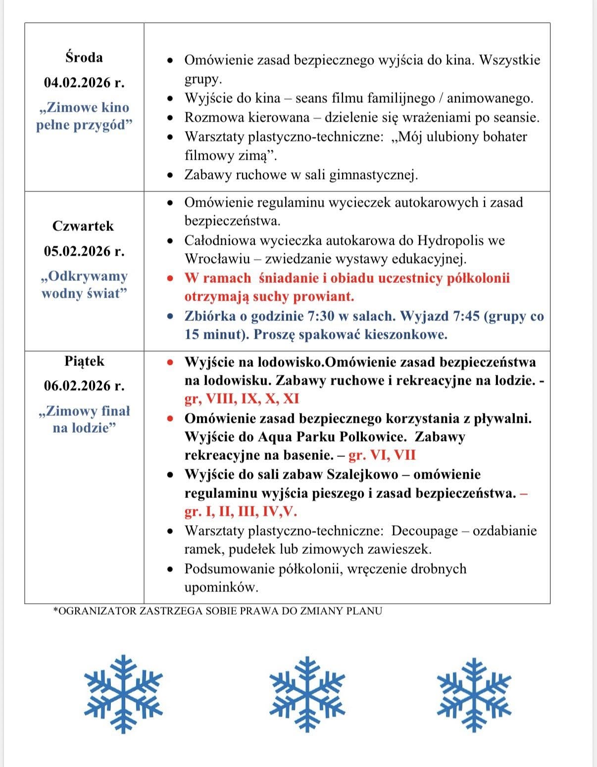 Już w poniedziałek rozpoczynamy tydzień pełen zimowych atrakcji i niezapomnianych emocji! Podczas ferii w SP3 dzieci czeka mnóstwo aktywności, zabawy i kreatywnych wyzwań: warsztaty plastyczno-techniczne, wyjście do kina i rozmowy o filmowych wrażeniach, zimowe szaleństwo na lodowisku, wodne atrakcje w Aqua Parku, zabawa w sali Szalejkowo, całodniowa wycieczka do Hydropolis we Wrocławiu – odkrywamy wodny świat, spotkanie z policjantem – rozmowy o bezpieczeństwie podczas ferii. Nie zabraknie też gier, zabaw ruchowych, wspólnej integracji oraz podsumowania ferii z drobnymi upominkami.