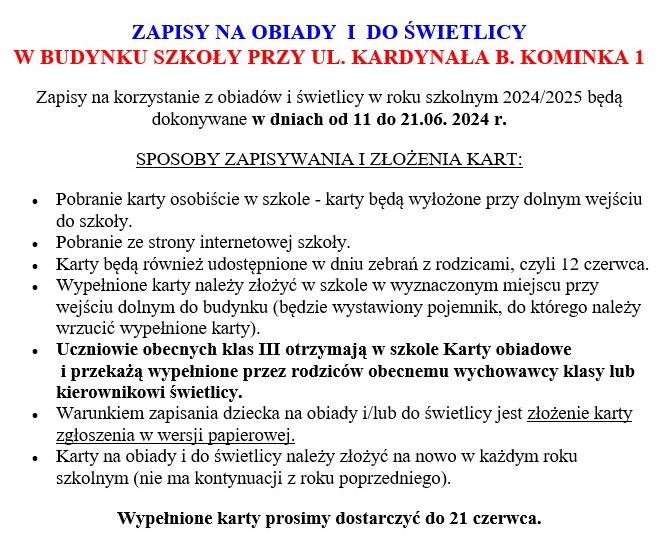 ZAPISY NA OBIADY I DO ŚWIETLICY NA ROK 2024/2025 - UL. KOMINKA