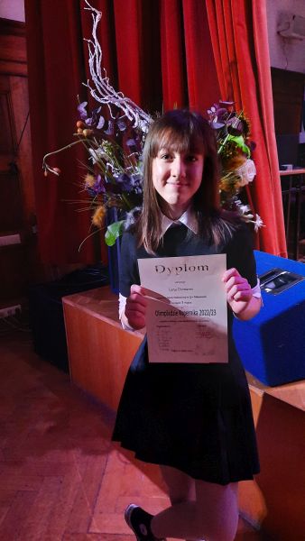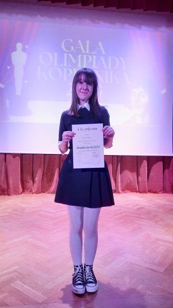 Od kilkunastu dni było wiadomo, że Lena Domaros z klasy VIII c jest jednym z sześciu laureatów konkursu Olimpiada Kopernika z języka polskiego, ale dopiero na piątkowej gali 31 marca 2023r. w LO nr 1 im. Mikołaja Kopernika w Lubinie wyczytano kolejność miejsc i okazało się, że zajęła 1. miejsce (spośród wszystkich uczniów biorących udział z powiatu lubińskiego i powiatów ościennych).