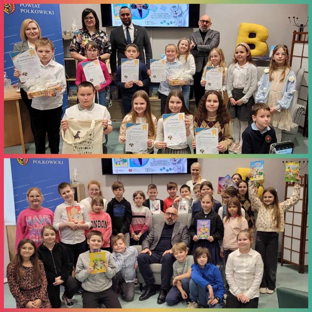 Wiktoria Karkowska z kl. 3c – laureatka 3 miejsca oraz wyróżnieni uczniowie: Klara Białowąs z kl. 3b, Kinga Chodor z kl. 3c i Łukasz Radziszewicz z kl. 3a, odebrali dyplomy i nagrody z rąk autora, wicestarosty powiatu polkowickiego oraz dyrektorki biblioteki.