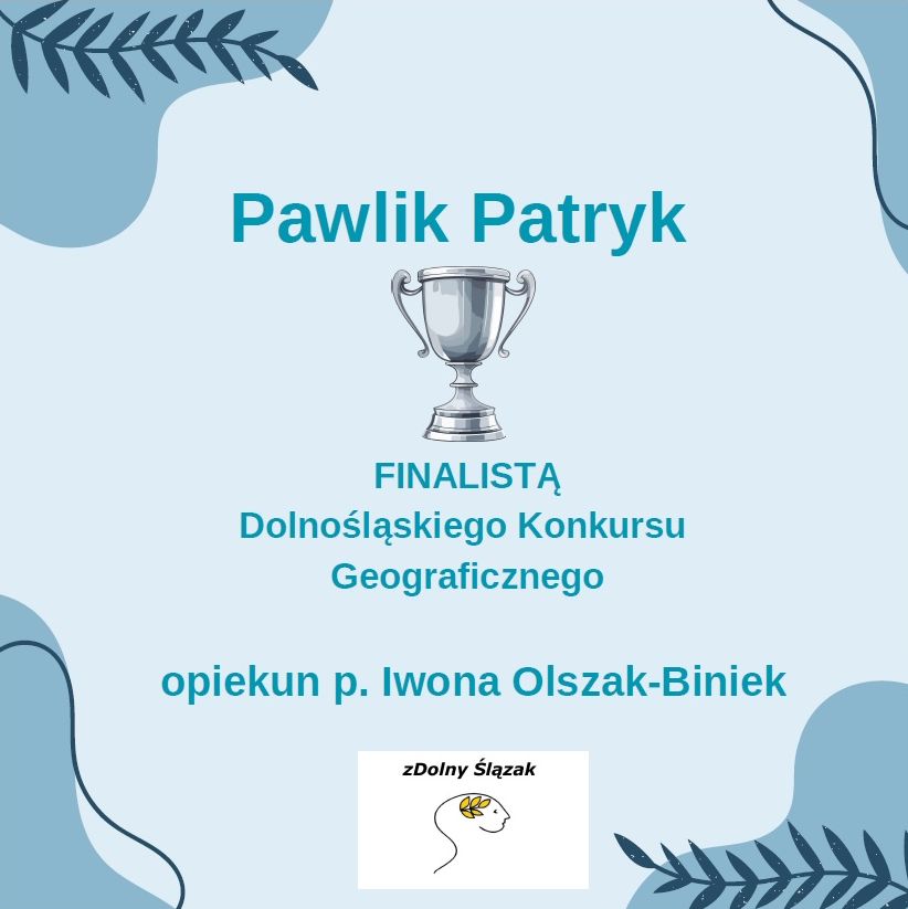 Z dumą i radością informujemy, że Kalina Szymczak z klasy 8b otrzymała tytuł LAUREATA Dolnośląskiego Konkursu Polonistycznego, Olga Małgowska z klasy 8d - tytuł LAUREATA Dolnośląskiego Konkursu Języka Angielskiego, natomiast Patryk Pawlik z klasy 7d został FINALISTĄ Dolnośląskiego Konkursu Geograficznego.