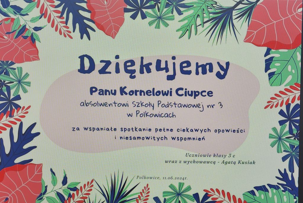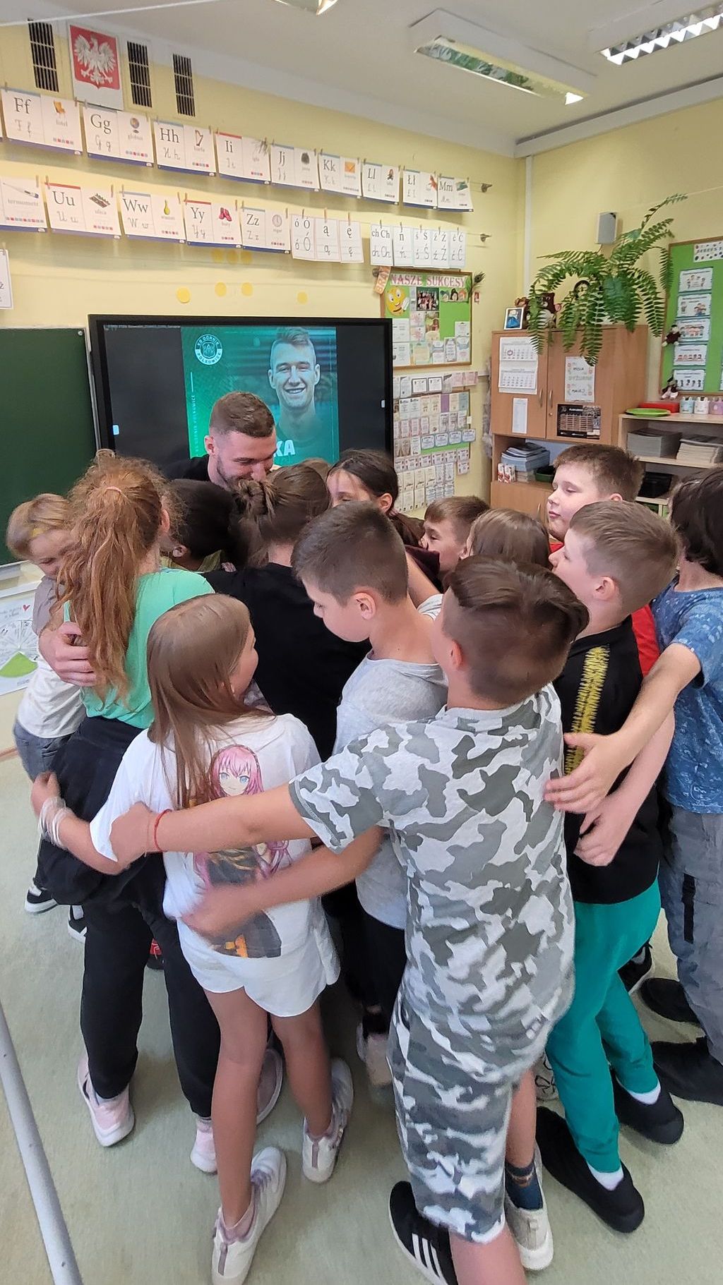 11 czerwca, uczniów klasy 3c odwiedził kolejny absolwent naszej szkoły. Tym razem był to Kornel Ciupka, piłkarz z wieloma sukcesami na koncie oraz wolontariusz, organizujący wiele akcji charytatywnych na rzecz bezdomnych zwierząt, m.in. ”Świąteczna paka dla psiaka i kociaka”. Podczas spotkania dzieci dużo dowiedziały się o przebiegu kariery piłkarskiej naszego gościa, o treningach i meczach oraz o radzeniu sobie z przegraną. Porozmawiały również o pomaganiu zwierzakom. Dzieci były pod ogromnym wrażeniem, z wielkim zainteresowaniem oglądały przygotowane przez Pana Kornela filmy i zdjęcia, słuchały jego opowieści, oglądały puchary i medale oraz, tradycyjnie, zadawały mnóstwo pytań. To było fascynujące spotkanie, zakończone rozdaniem autografów i wspólnymi zdjęciami.