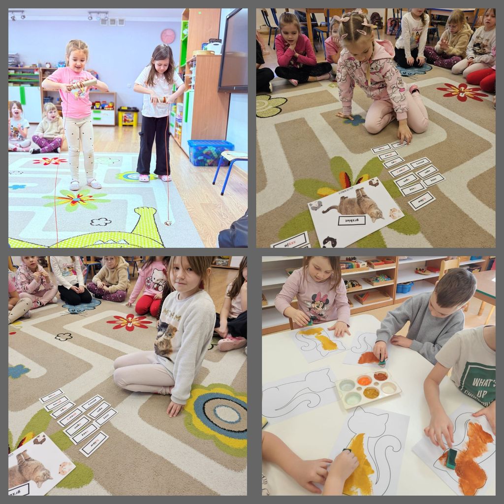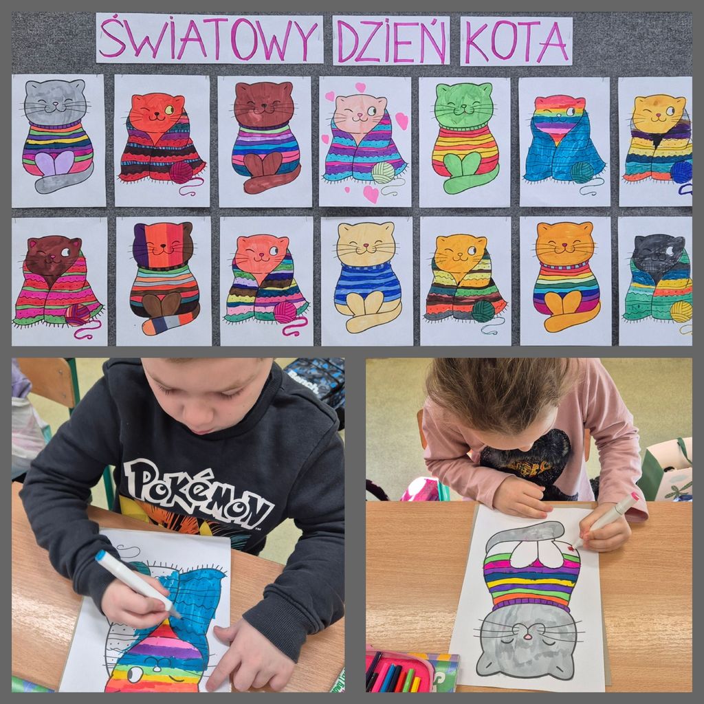 17 lutego przedszkolaki oraz uczniowie klasy pierwszej obchodzili „Światowy Dzień Kota”. W tym dniu dzieci upodobniły się do czworonożnych przyjaciół, poprzez wymalowanie na buziach kocich nosków, wąsów i uszek, zapoznały się z kocimi obyczajami i ciekawostkami oraz wykonały prace plastyczne. Ponadto wzięły udział w wesołych „kocich zabawach" muzyczno - ruchowych, dywanowych oraz interaktywnych i poznały historię pewnego kotka, spisaną w pięknej książeczce pt. "Kocie troski".