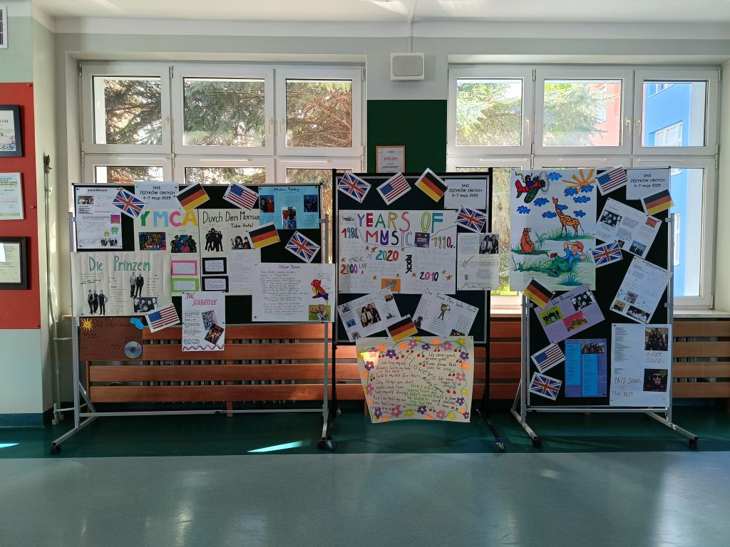 W ramach Dni Języków Obcych w holu szkoły przy ul. Ociosowej odbyła się także wystawa przygotowywanych przez uczniów plakatów przestawiających wylosowane utwory i ich wykonawców.