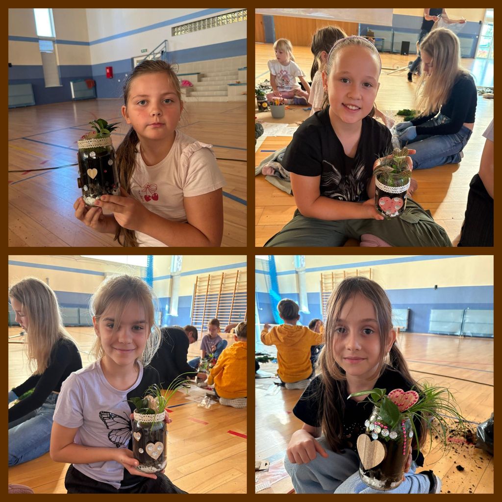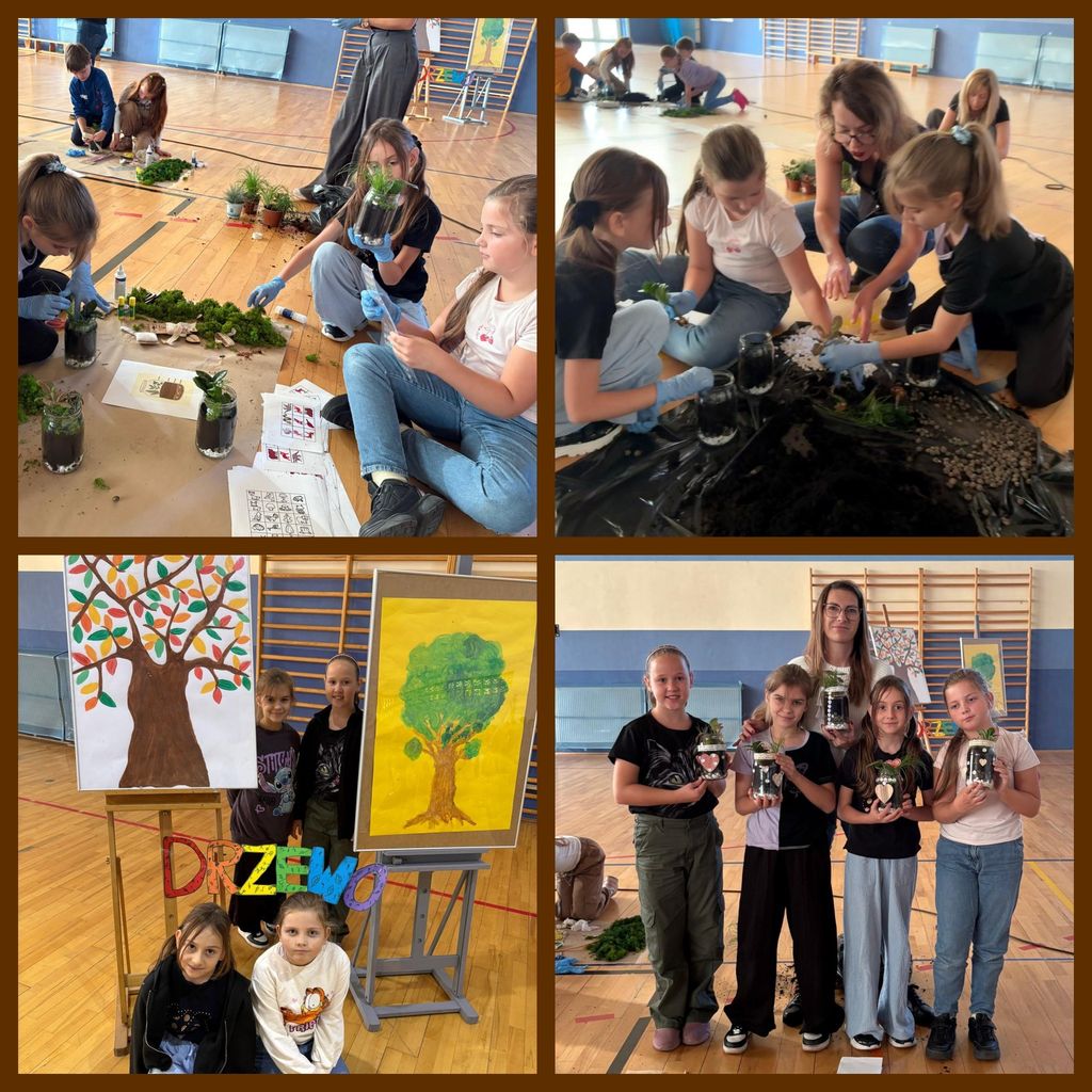 Z okazji Święta Drzewa, nasi najmłodsi uczniowie uczestniczyli w różnorodnych aktywnościach związanych z tematyką drzew. Kilka uczennic z klasy 3c wzięło udział w wyjątkowych warsztatach przyrodniczych pt. "Las w słoiku", zorganizowanych przez Szkołę Podstawową nr 4. Przedszkolaki oraz uczniowie klasy 2d uczestniczyli w Polkowickim Dniu Drzewa, podczas którego na Rynku wzięli udział w przeróżnych działaniach ekologicznych, m. in. tworzyli różne ekocuda z liści i szyszek, malowali ekotorby, kamienie i magnetyczne kolorowanki, brali udział w warsztatach „Tajemnica natury w papierze”, a także korzystali z fotobudki, dmuchańców i koła fortuny. Pozostali uczniowie wzięli udział w szkolnych zajęciach związanych ze Świętem Drzewa. Wszyscy wysłuchali w klasach ciekawych prelekcji o drzewach i ich budowie, a także o warstwach lasu oraz ogromnym znaczeniu lasów dla życia na Ziemi. W tym dniu dzieci kodowały drzewa oraz przedstawiały je w wielu technikach plastycznych, dzięki czemu w klasach powstały piękne galerie. To był dzień pełen wiedzy, inspiracji i radości!
