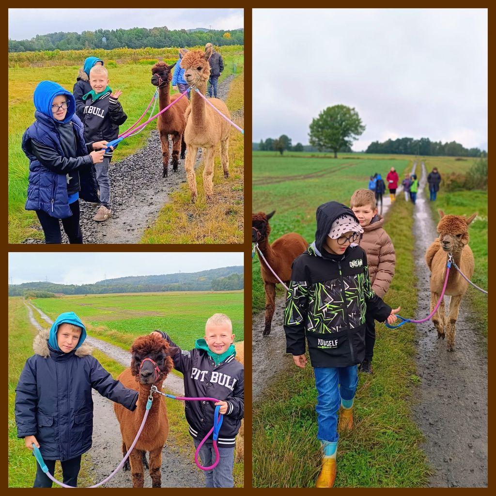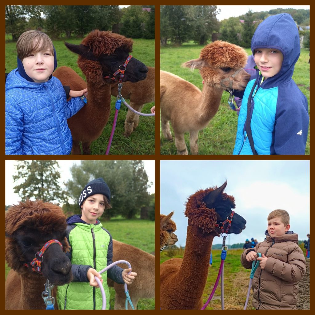 Grupa uczniów z klas drugich i trzecich, pod opieką Pani pedagog Marleny Rudnickiej oraz Pani bibliotekarki - Zuzanny Szczęsnej, uczestniczyła w wyjazdowych warsztatach arteterapeutycznych, które odbyły się w zagrodzie „Alpalogos”- Alpaki z Krainy Wygasłych Wulkanów. Uczestnicy wyruszyli na wyprawę w poszukiwaniu odpowiedzi na pytanie: "Czy dzieciaki lubią alpaki – czy alpaki lubią dzieciaki?". Okazało się, że spotkanie z tymi cudownymi zwierzętami przyniosło dzieciom wiele pozytywnych przeżyć. Spacer z Lusią i Żaklin był prawdziwą frajdą. Uczniowie poznali zachowania alpak i uczyli się wrażliwości wobec zwierząt. Gospodarze wycieczki, pani Martyna i pan Kamil, z pasją opowiadali o życiu tych zwierząt, a także zorganizowali dla dzieci warsztaty artystyczne, ognisko oraz atrakcyjne zabawy. To był fantastyczny dzień, który pomimo jesiennej aury dał wszystkim niesamowicie dużo radości. I teraz dzieci wiedzą już na pewno, że "dzieciaki kochają alpaki, a alpaki kochają dzieciaki".