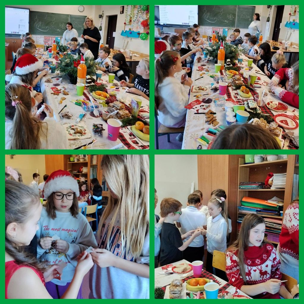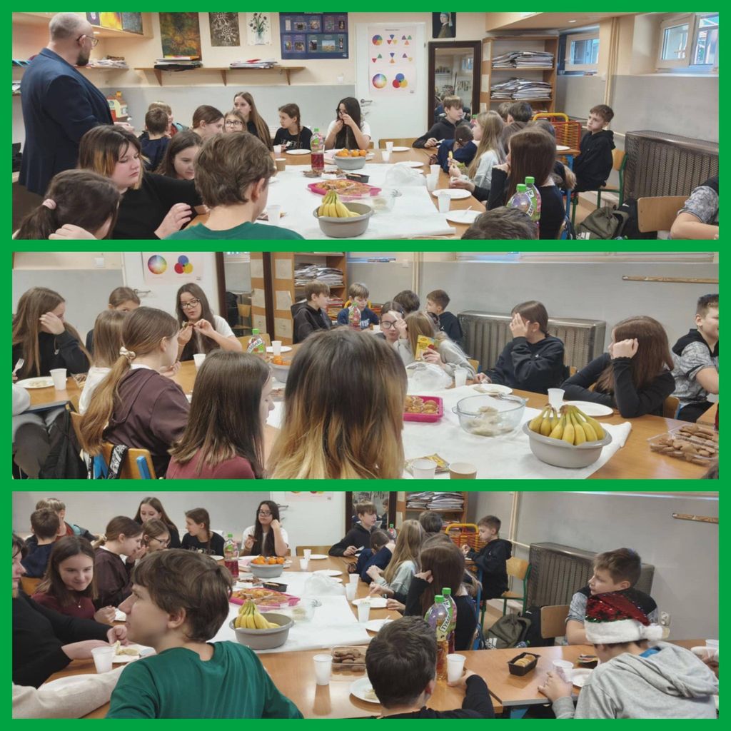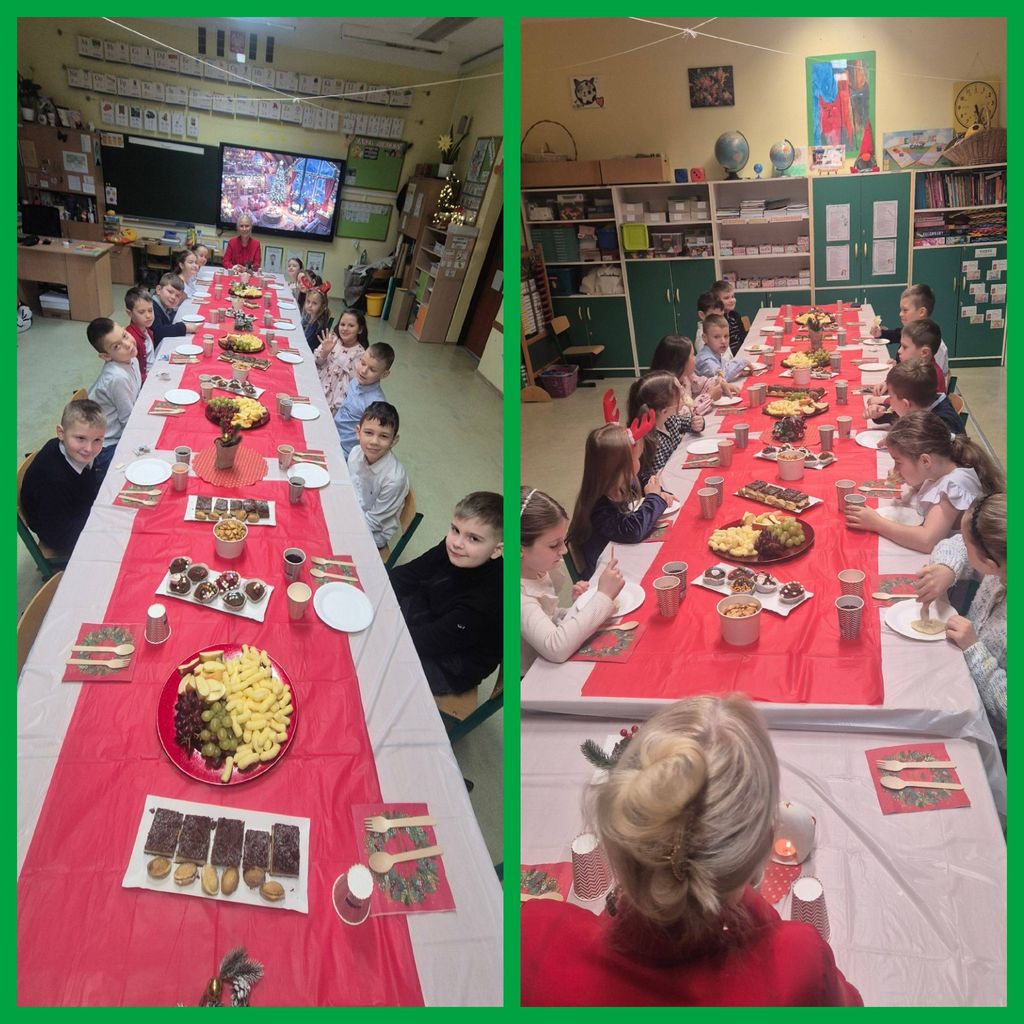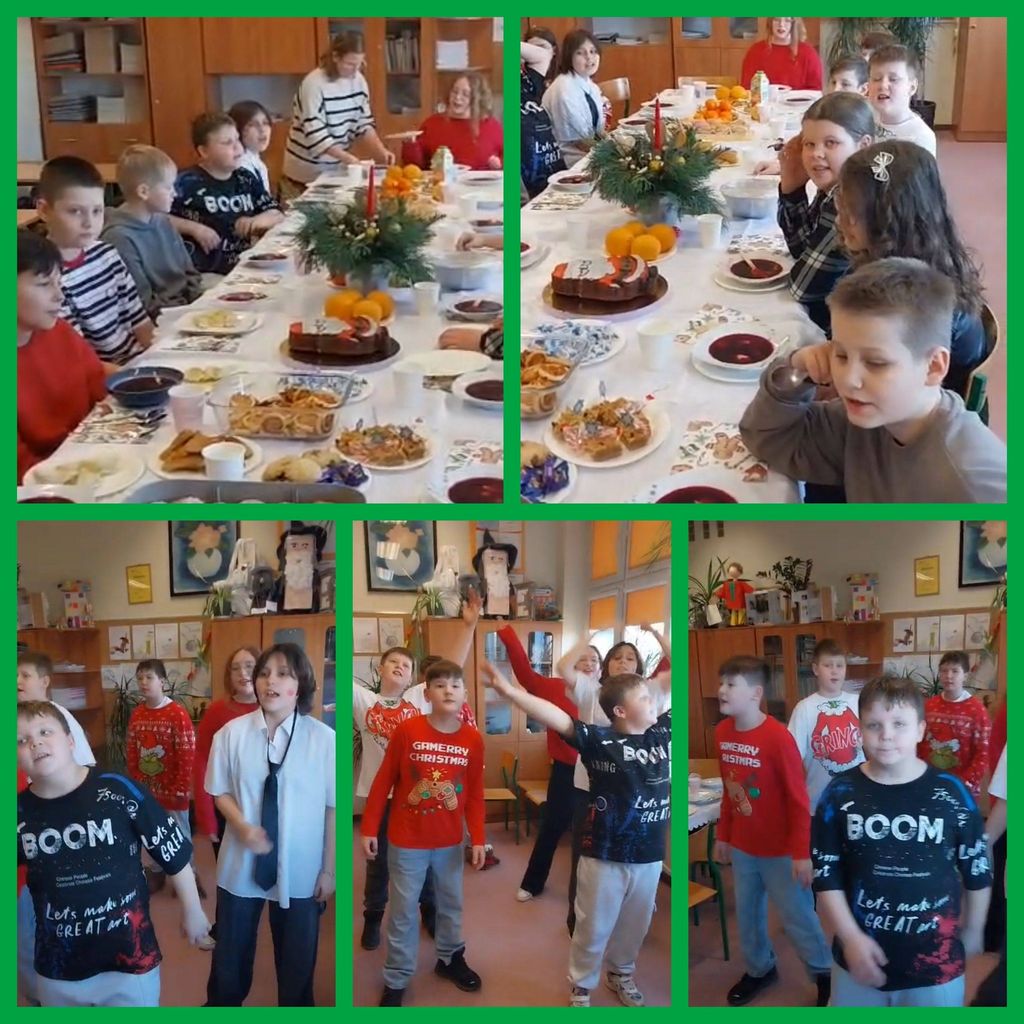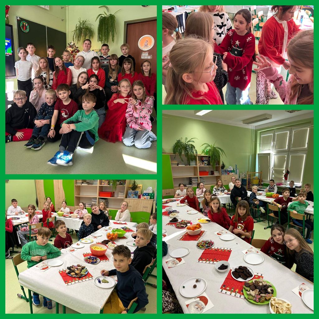 19 grudnia we wszystkich klasach naszej szkoły odbyły się klasowe wigilie, które wprowadziły uczniów oraz nauczycieli w świąteczny nastrój i zbliżyły do siebie całą społeczność klasową. Wigilie rozpoczęło wspólne dzielenie się opłatkiem, co było momentem szczególnej serdeczności. Wszyscy składali sobie nawzajem życzenia zdrowia, szczęścia oraz sukcesów w nadchodzącym roku. Następnie zasiedli do stołów, gdzie czekały tradycyjne potrawy wigilijne: barszcz, pierogi, a także dużo słodkości - ciast, babeczek i oczywiście pierniczków. Ważnym punktem wigilii było wspólne kolędowanie. Dzieci radośnie śpiewały, co sprawiło, że całe sale wypełniły się ciepłem i magią Świąt Bożego Narodzenia.