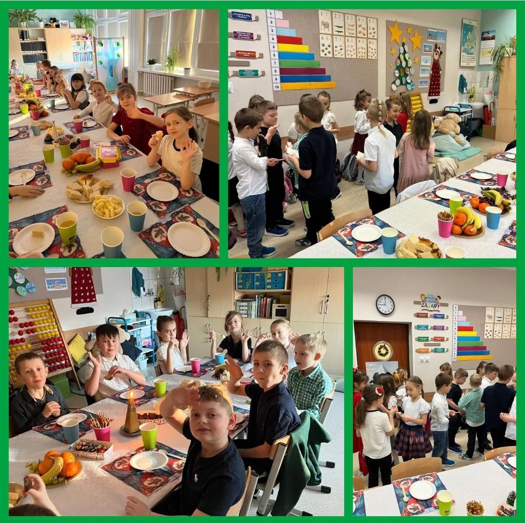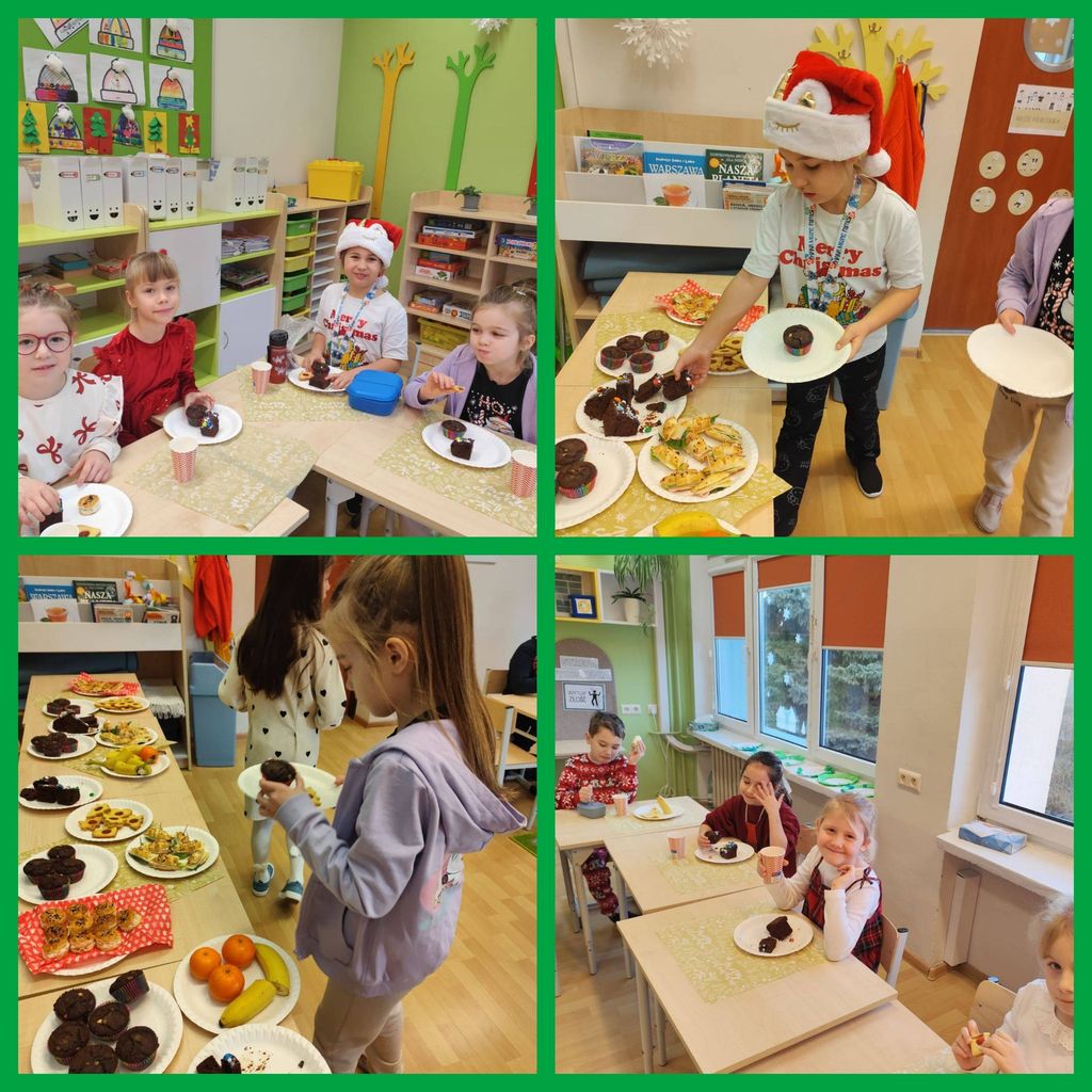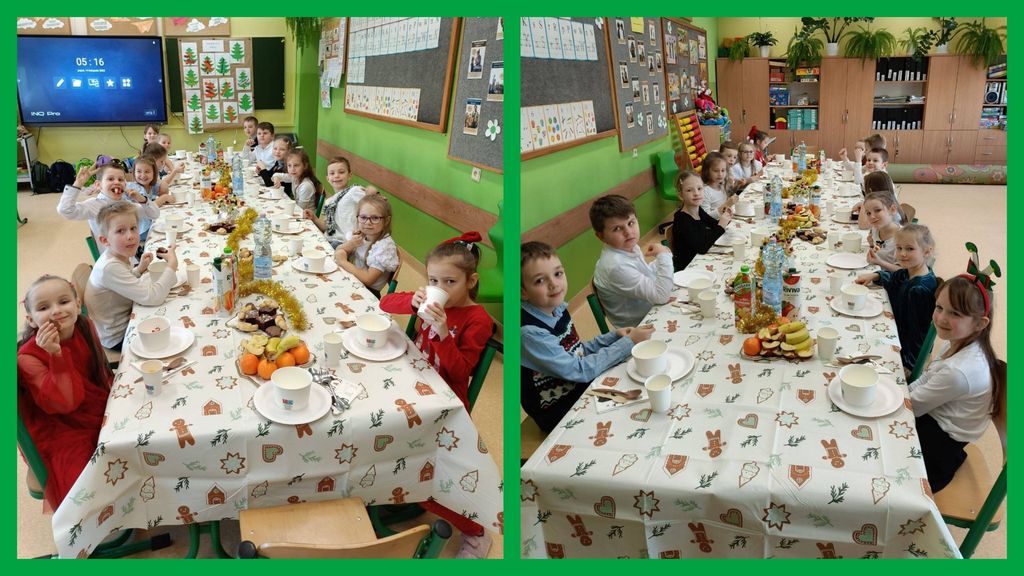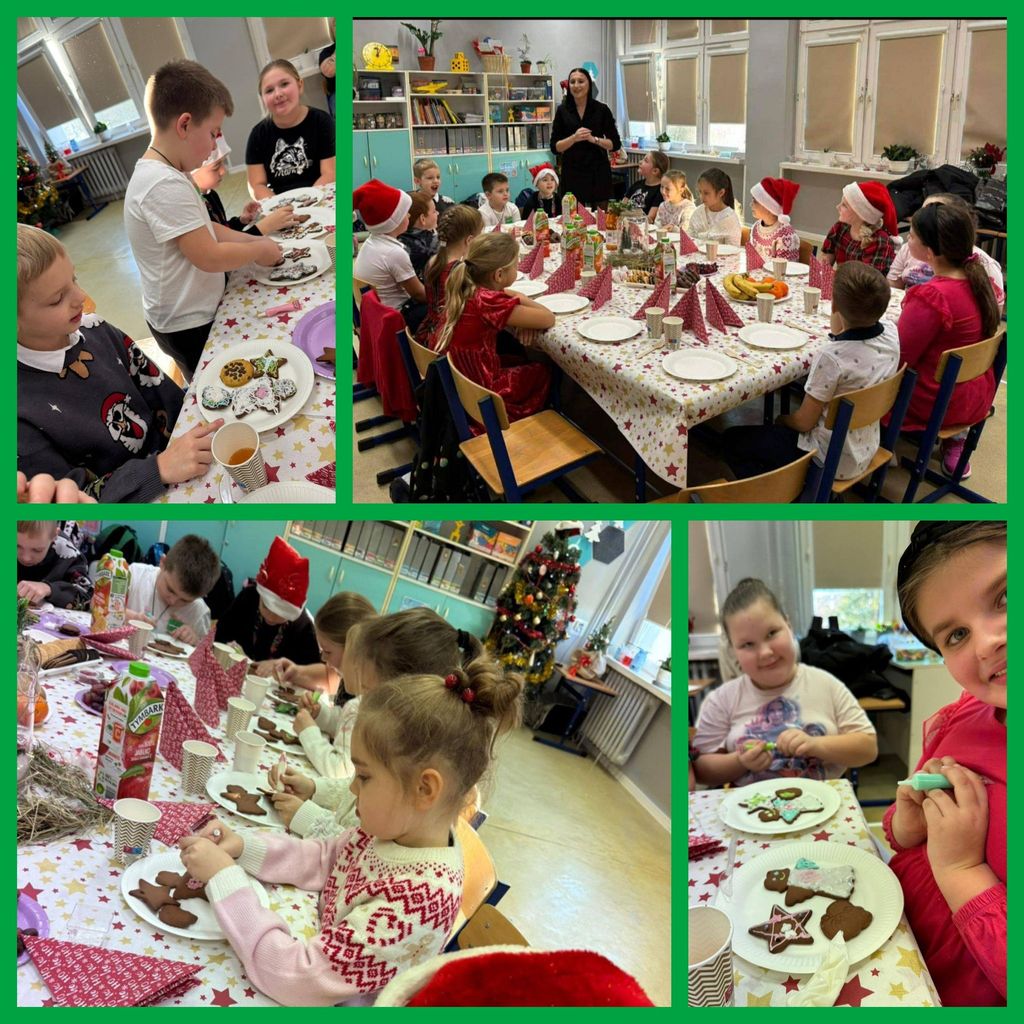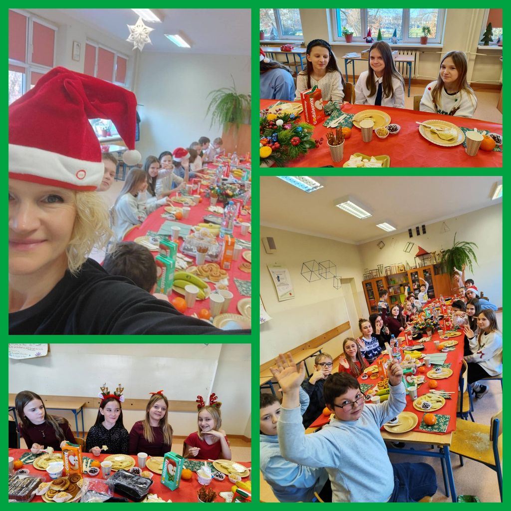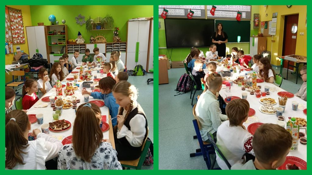 19 grudnia we wszystkich klasach naszej szkoły odbyły się klasowe wigilie, które wprowadziły uczniów oraz nauczycieli w świąteczny nastrój i zbliżyły do siebie całą społeczność klasową. Wigilie rozpoczęło wspólne dzielenie się opłatkiem, co było momentem szczególnej serdeczności. Wszyscy składali sobie nawzajem życzenia zdrowia, szczęścia oraz sukcesów w nadchodzącym roku. Następnie zasiedli do stołów, gdzie czekały tradycyjne potrawy wigilijne: barszcz, pierogi, a także dużo słodkości - ciast, babeczek i oczywiście pierniczków. Ważnym punktem wigilii było wspólne kolędowanie. Dzieci radośnie śpiewały, co sprawiło, że całe sale wypełniły się ciepłem i magią Świąt Bożego Narodzenia.