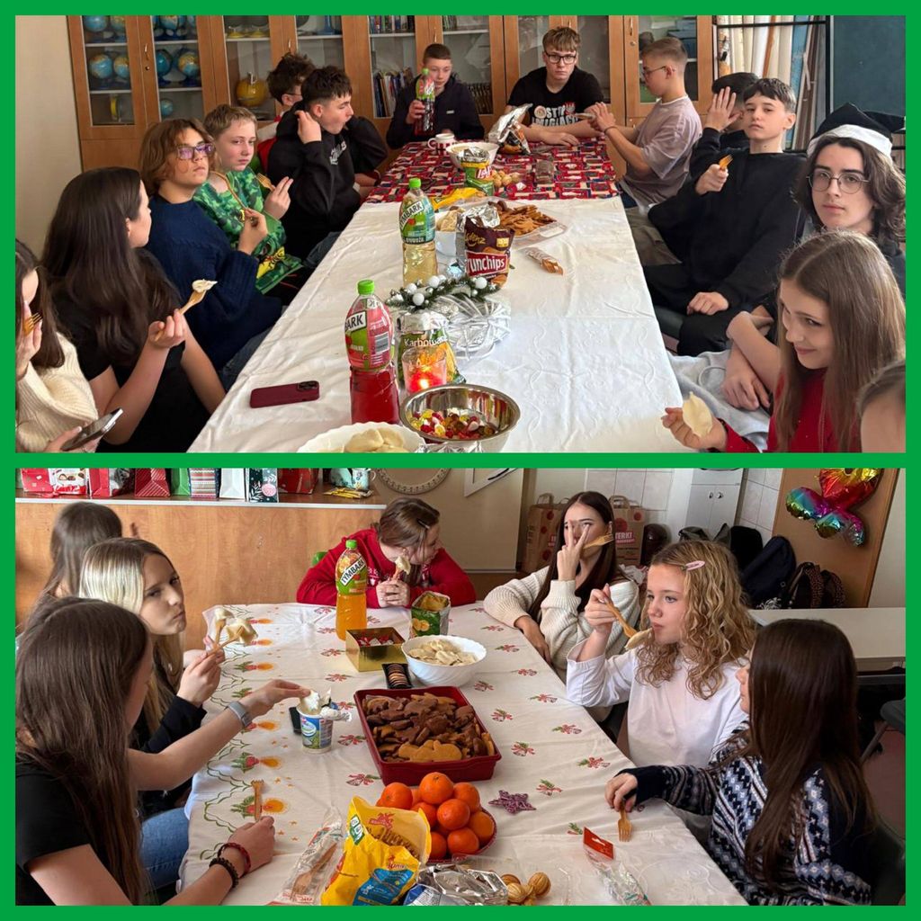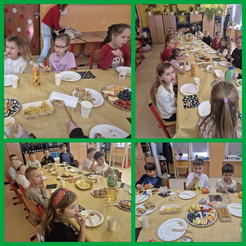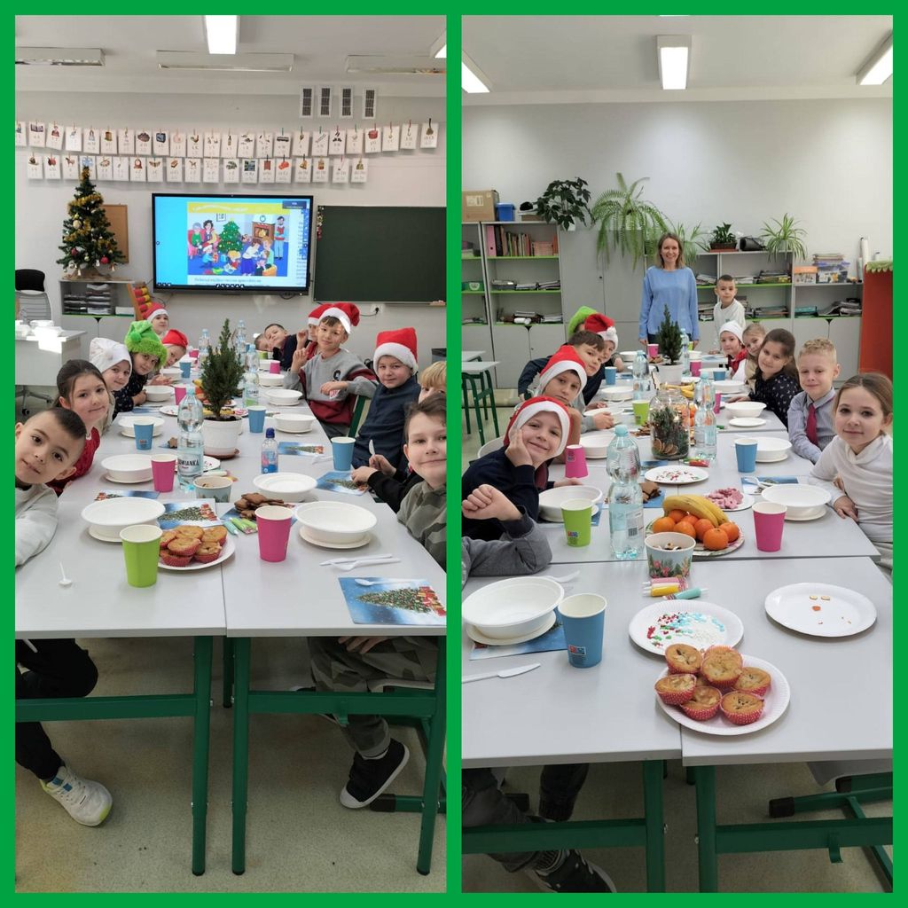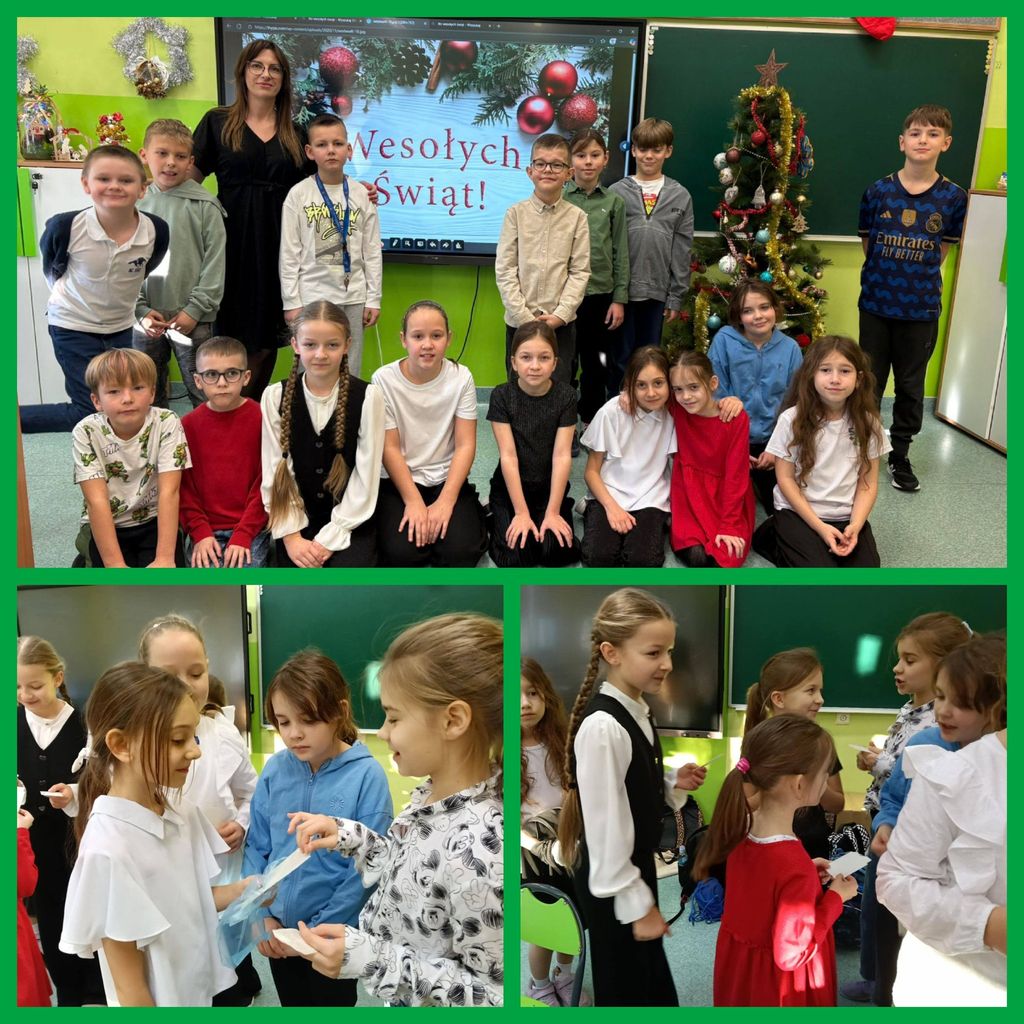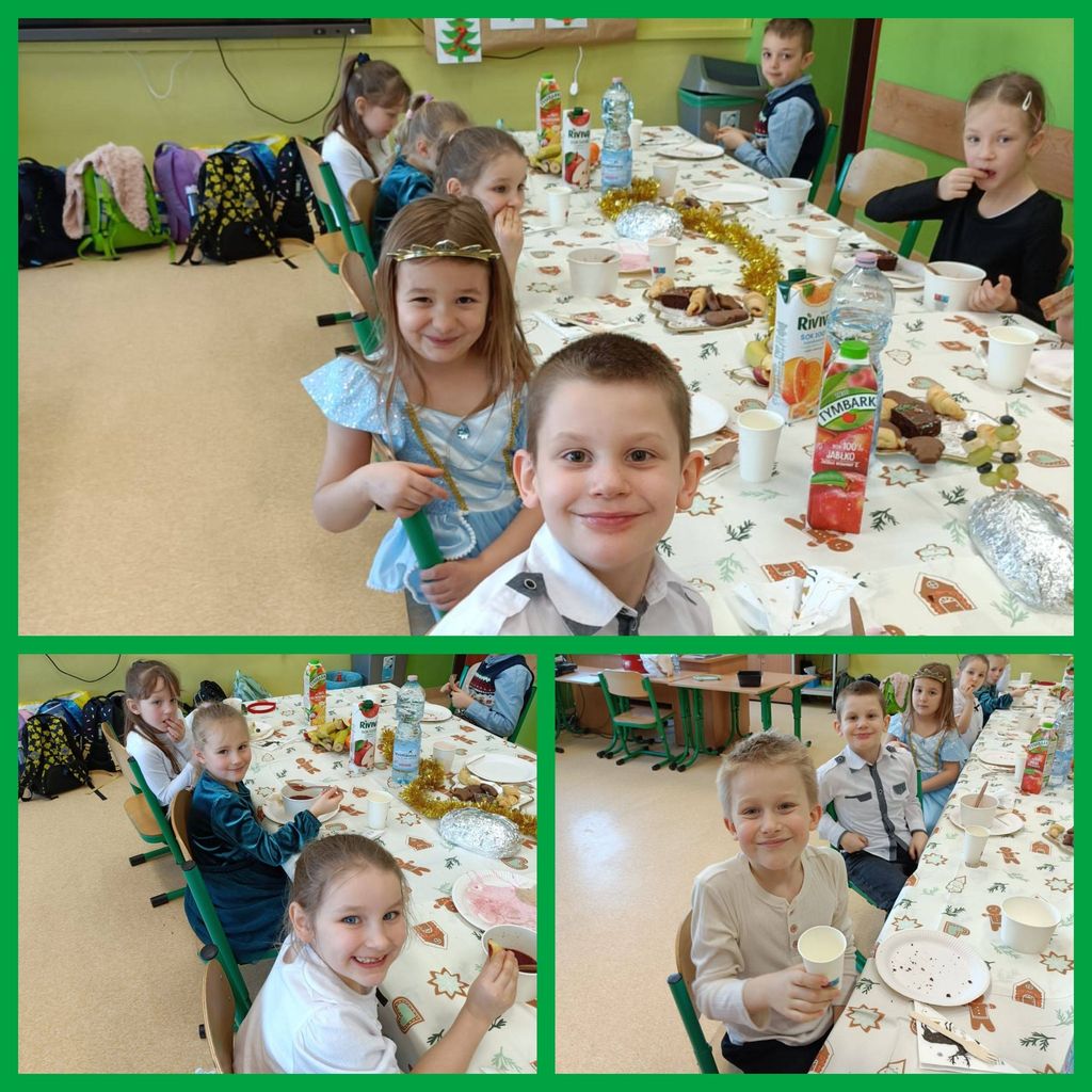 19 grudnia we wszystkich klasach naszej szkoły odbyły się klasowe wigilie, które wprowadziły uczniów oraz nauczycieli w świąteczny nastrój i zbliżyły do siebie całą społeczność klasową. Wigilie rozpoczęło wspólne dzielenie się opłatkiem, co było momentem szczególnej serdeczności. Wszyscy składali sobie nawzajem życzenia zdrowia, szczęścia oraz sukcesów w nadchodzącym roku. Następnie zasiedli do stołów, gdzie czekały tradycyjne potrawy wigilijne: barszcz, pierogi, a także dużo słodkości - ciast, babeczek i oczywiście pierniczków. Ważnym punktem wigilii było wspólne kolędowanie. Dzieci radośnie śpiewały, co sprawiło, że całe sale wypełniły się ciepłem i magią Świąt Bożego Narodzenia.