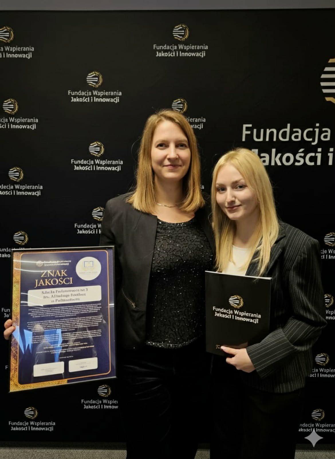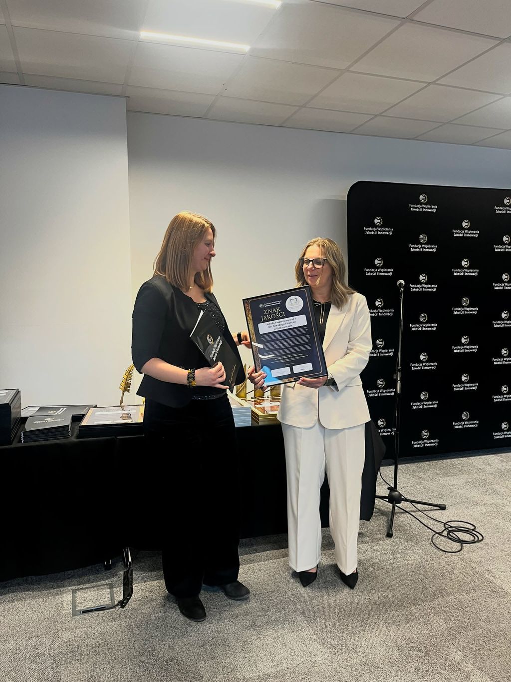 Z dumą informujemy, że nasza szkoła otrzymała Certyfikat Znaku Jakości „Kreatywna Szkoła – Innowacyjny Uczeń”, przyznawany przez Fundacja Wspierania Jakości i Innowacji. W imieniu całej społeczności szkolnej wyróżnienie odebrały Urszula Drabek-Mazur oraz Alicja Szczypecka.