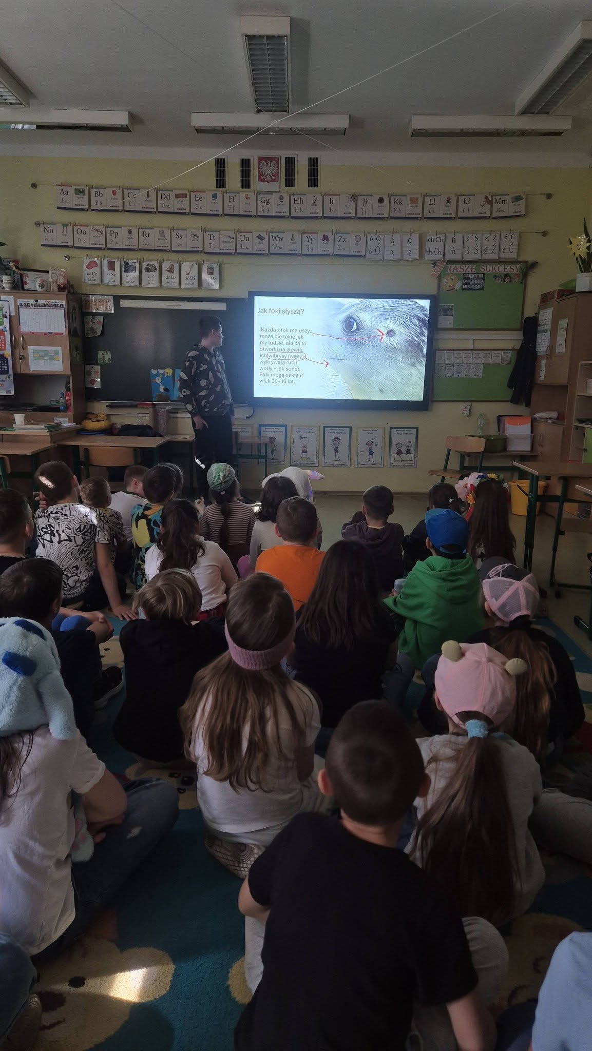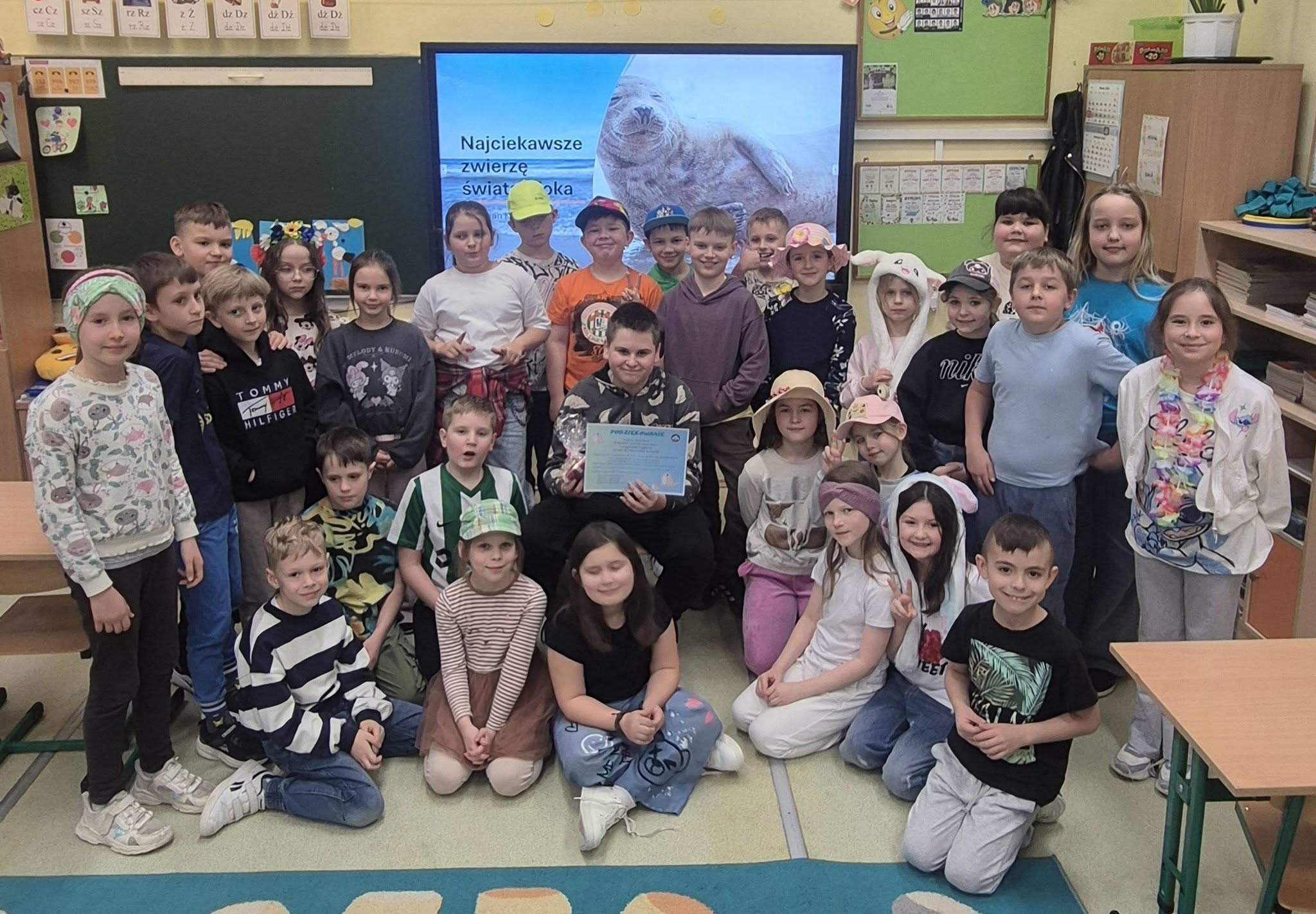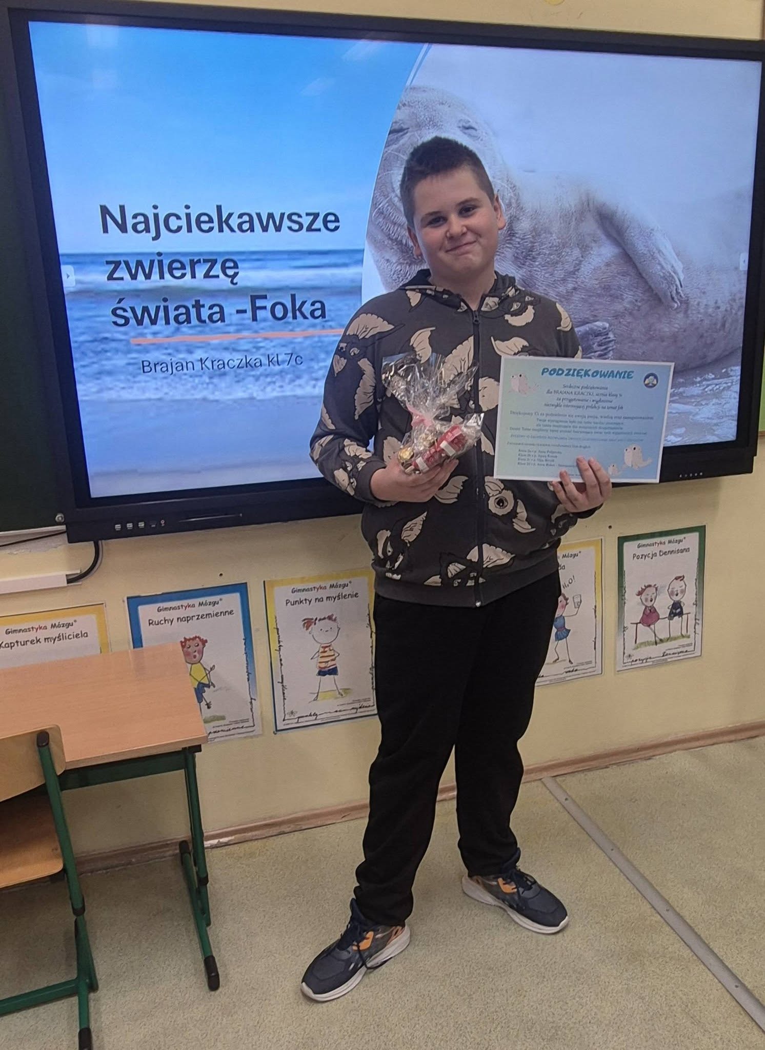 16 marca uczeń klasy 7c - Brajan Kraczka - przygotował i wygłosił dla wszystkich uczniów klas drugich prelekcję na temat fok. Podczas spotkania przedstawił wiele ciekawych informacji dotyczących życia tych zwierząt, ich środowiska naturalnego oraz sposobu odżywiania. Prelekcja była bardzo interesująca, zawierała dużo wartościowych oraz zaskakujących wiadomości, które wzbudziły ogromne zainteresowanie słuchaczy. Spotkanie było kolejnym elementem udziału naszej szkoły w powiatowym konkursie „Łączy nas więcej niż WiFi". Brajan pokazał nam wszystkim, jak pięknie można spędzać czas bez ekranu smartfona. Dziękujemy mu za wspaniałe spotkanie, podczas którego zaprezentował siebie i swoją ogromną pasję. Dzięki takim momentom tworzymy społeczność, w której każde połączenie ma znaczenie.