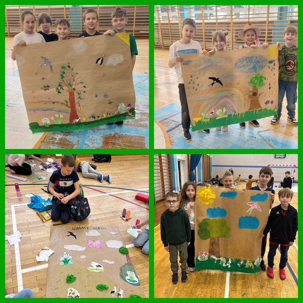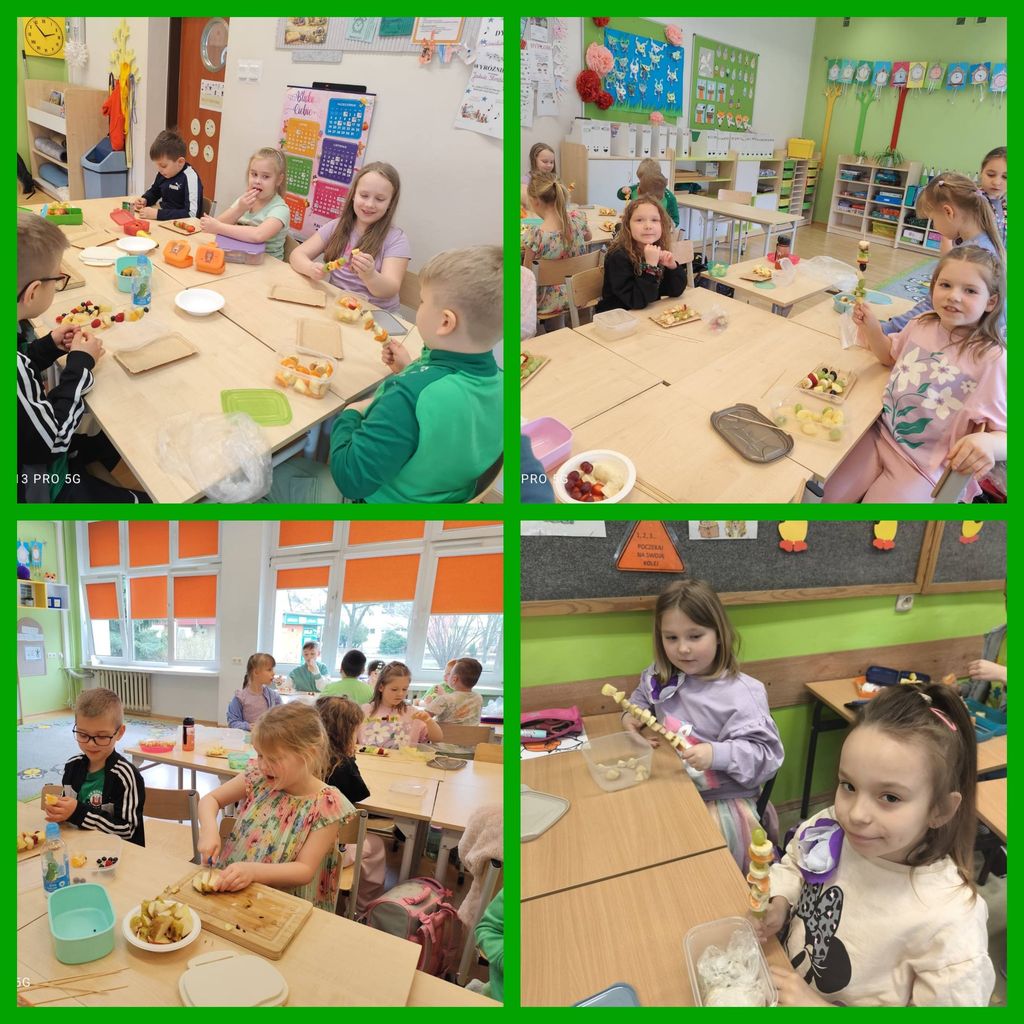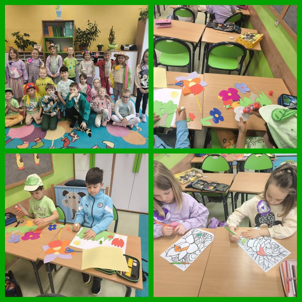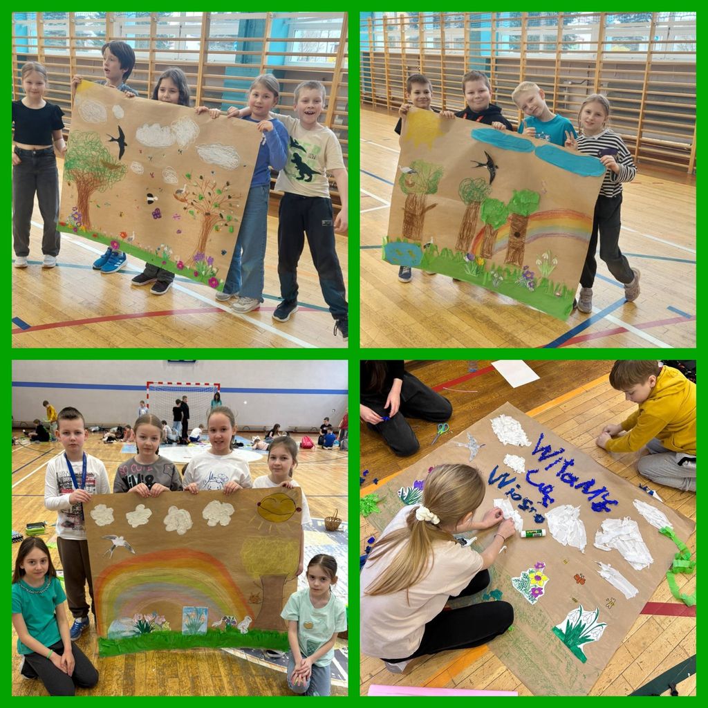 Powitanie wiosny w klasach 0–3 było pełne radości, kreatywności i aktywności. Uczniowie celebrowali nadejście nowej pory roku na wiele różnorodnych sposobów. Dzieci brały udział w zmaganiach sportowych, podczas których mogły sprawdzić swoją sprawność fizyczną i współpracę w grupie. Nie zabrakło również działań plastycznych – uczniowie przygotowywali kolorowe plakaty na powitanie Wiosny oraz tworzyli portrety Pani Wiosny, wykazując się dużą pomysłowością i zaangażowaniem. W ramach zajęć kulinarnych dzieci samodzielnie przygotowywały owocowe szaszłyki, ucząc się zdrowych nawyków żywieniowych oraz zasad bezpiecznej pracy. Dużym zainteresowaniem cieszył się także wiosenny turniej matematyczno - przyrodniczy z elementami gimnastycznymi, który połączył naukę z ruchem i dobrą zabawą. Dodatkowo uczniowie uczestniczyli w wycieczce na ogródki działkowe, gdzie mieli okazję obserwować wiosenny wzrost roślin. Dzieci aktywnie włączyły się w prace porządkowe – kosiły trawę oraz grabiły, ucząc się szacunku do przyrody i pracy fizycznej. Powitanie wiosny było dla wszystkich uczniów wyjątkowym czasem, pełnym uśmiechu, nauki i wspólnego świętowania.