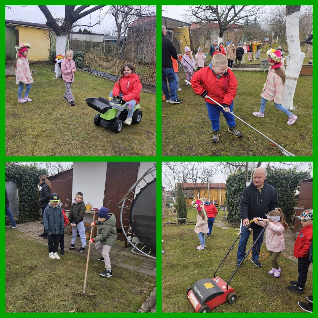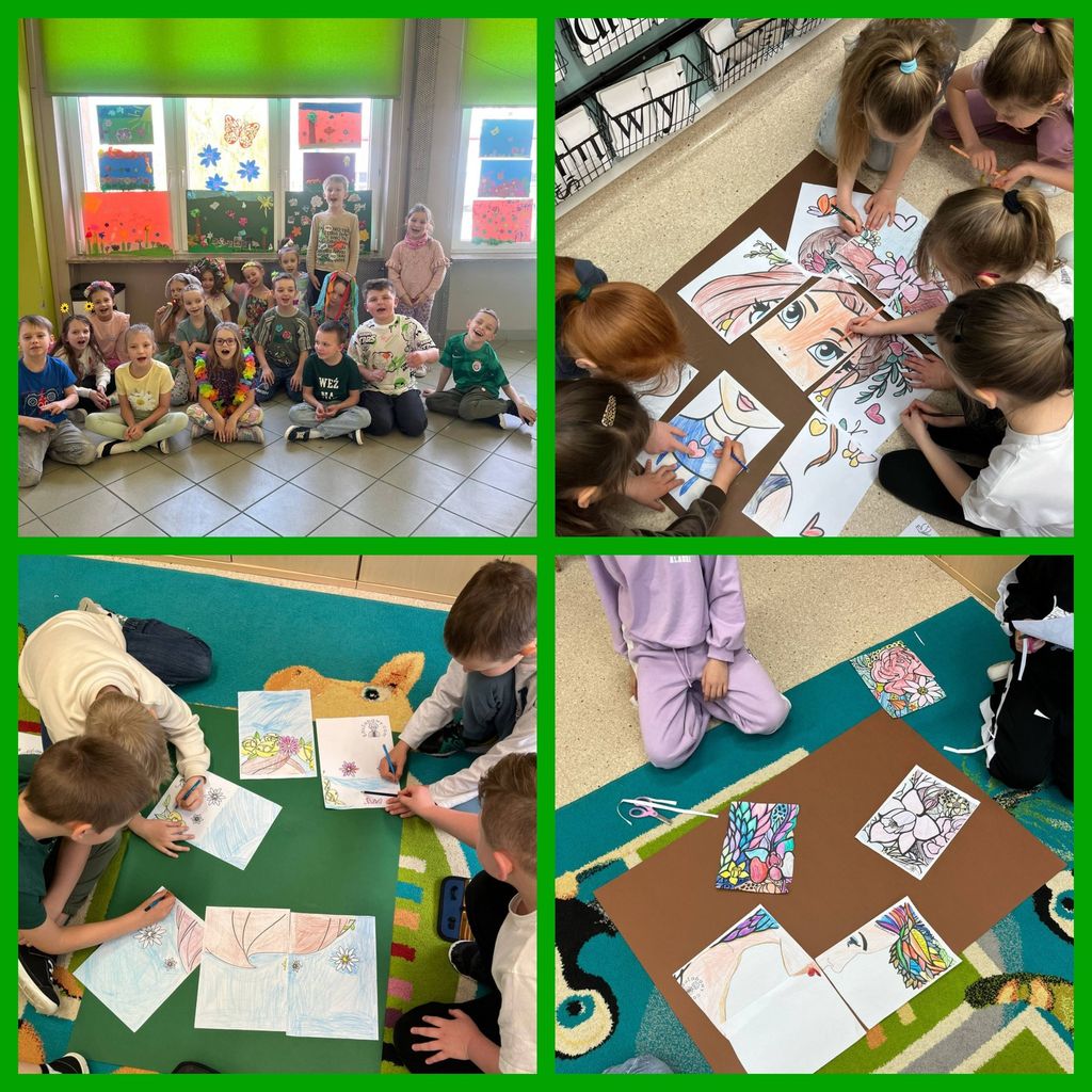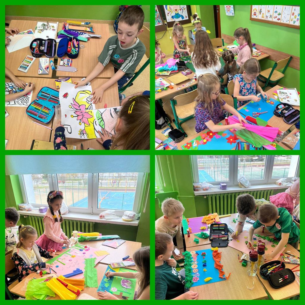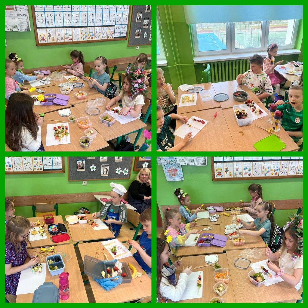 Powitanie wiosny w klasach 0–3 było pełne radości, kreatywności i aktywności. Uczniowie celebrowali nadejście nowej pory roku na wiele różnorodnych sposobów. Dzieci brały udział w zmaganiach sportowych, podczas których mogły sprawdzić swoją sprawność fizyczną i współpracę w grupie. Nie zabrakło również działań plastycznych – uczniowie przygotowywali kolorowe plakaty na powitanie Wiosny oraz tworzyli portrety Pani Wiosny, wykazując się dużą pomysłowością i zaangażowaniem. W ramach zajęć kulinarnych dzieci samodzielnie przygotowywały owocowe szaszłyki, ucząc się zdrowych nawyków żywieniowych oraz zasad bezpiecznej pracy. Dużym zainteresowaniem cieszył się także wiosenny turniej matematyczno - przyrodniczy z elementami gimnastycznymi, który połączył naukę z ruchem i dobrą zabawą. Dodatkowo uczniowie uczestniczyli w wycieczce na ogródki działkowe, gdzie mieli okazję obserwować wiosenny wzrost roślin. Dzieci aktywnie włączyły się w prace porządkowe – kosiły trawę oraz grabiły, ucząc się szacunku do przyrody i pracy fizycznej. Powitanie wiosny było dla wszystkich uczniów wyjątkowym czasem, pełnym uśmiechu, nauki i wspólnego świętowania.