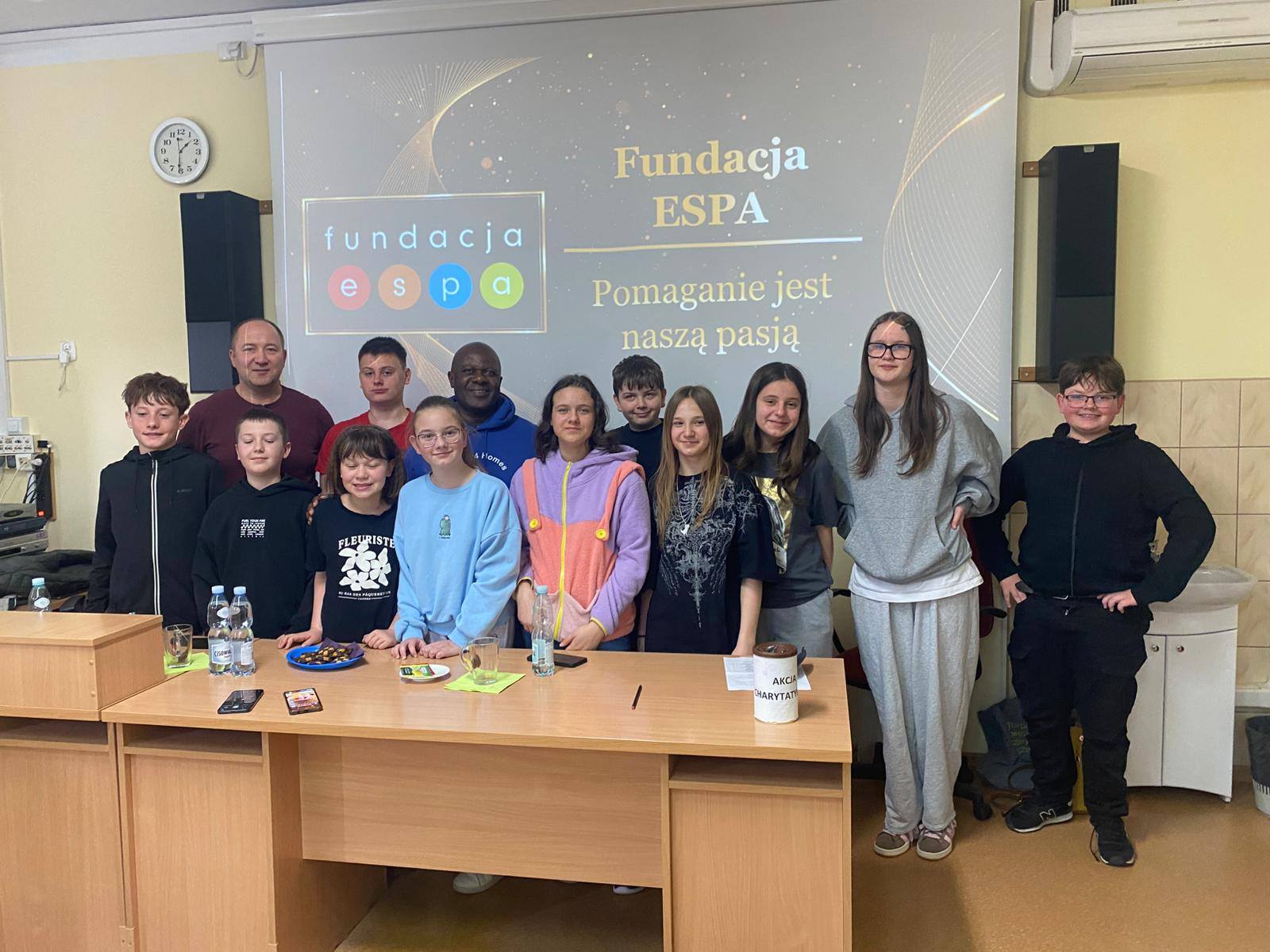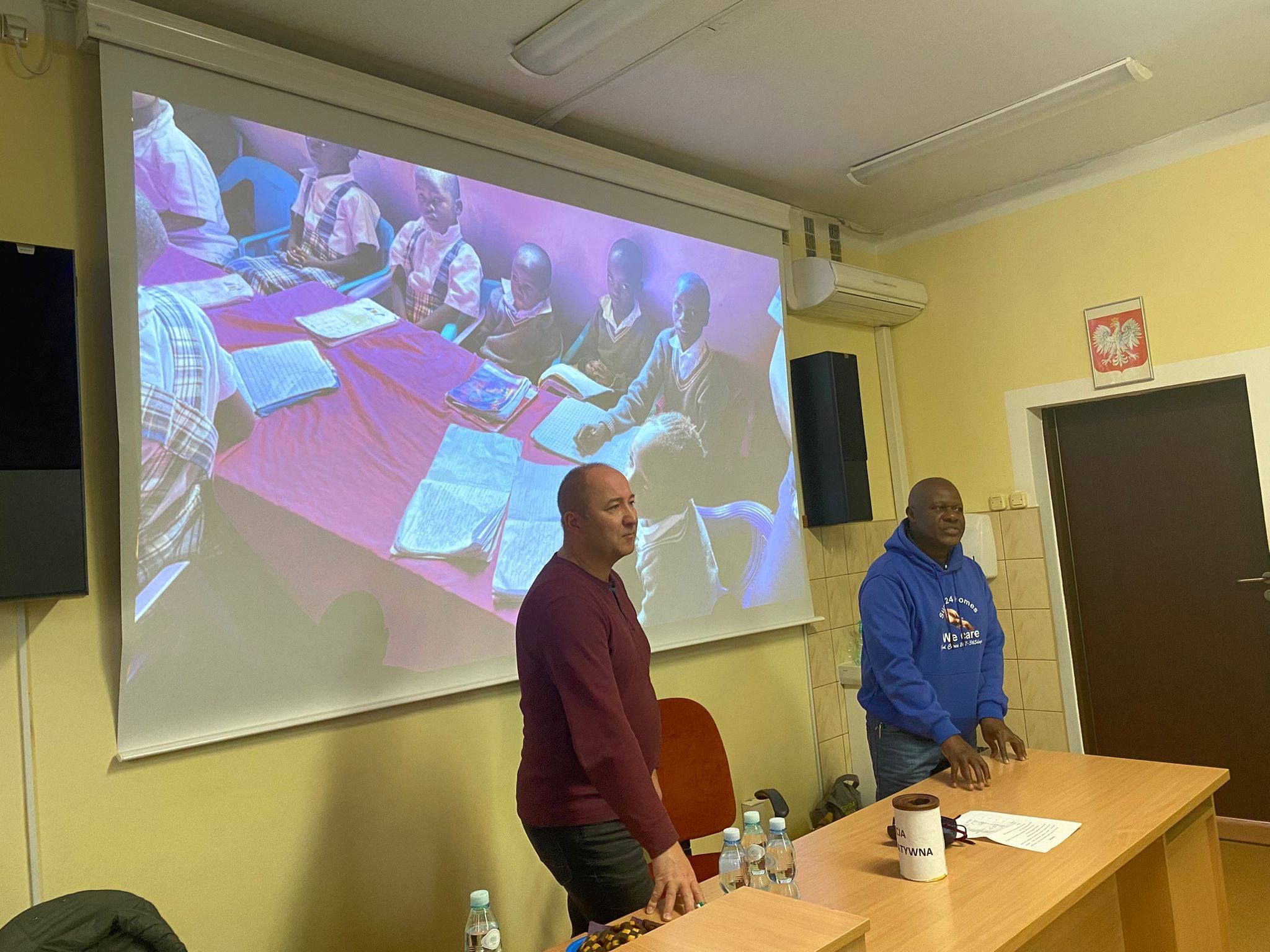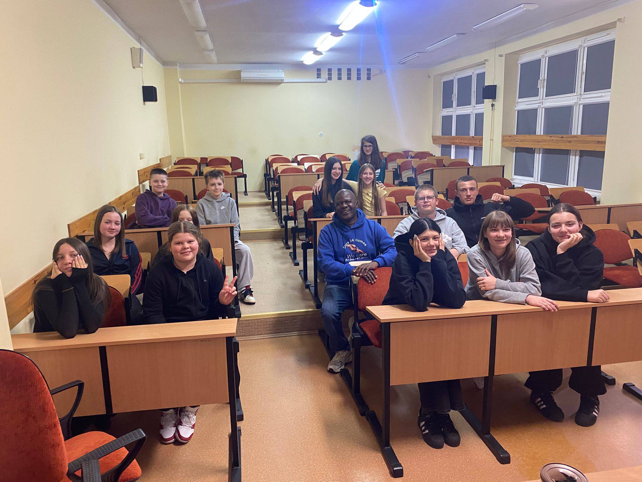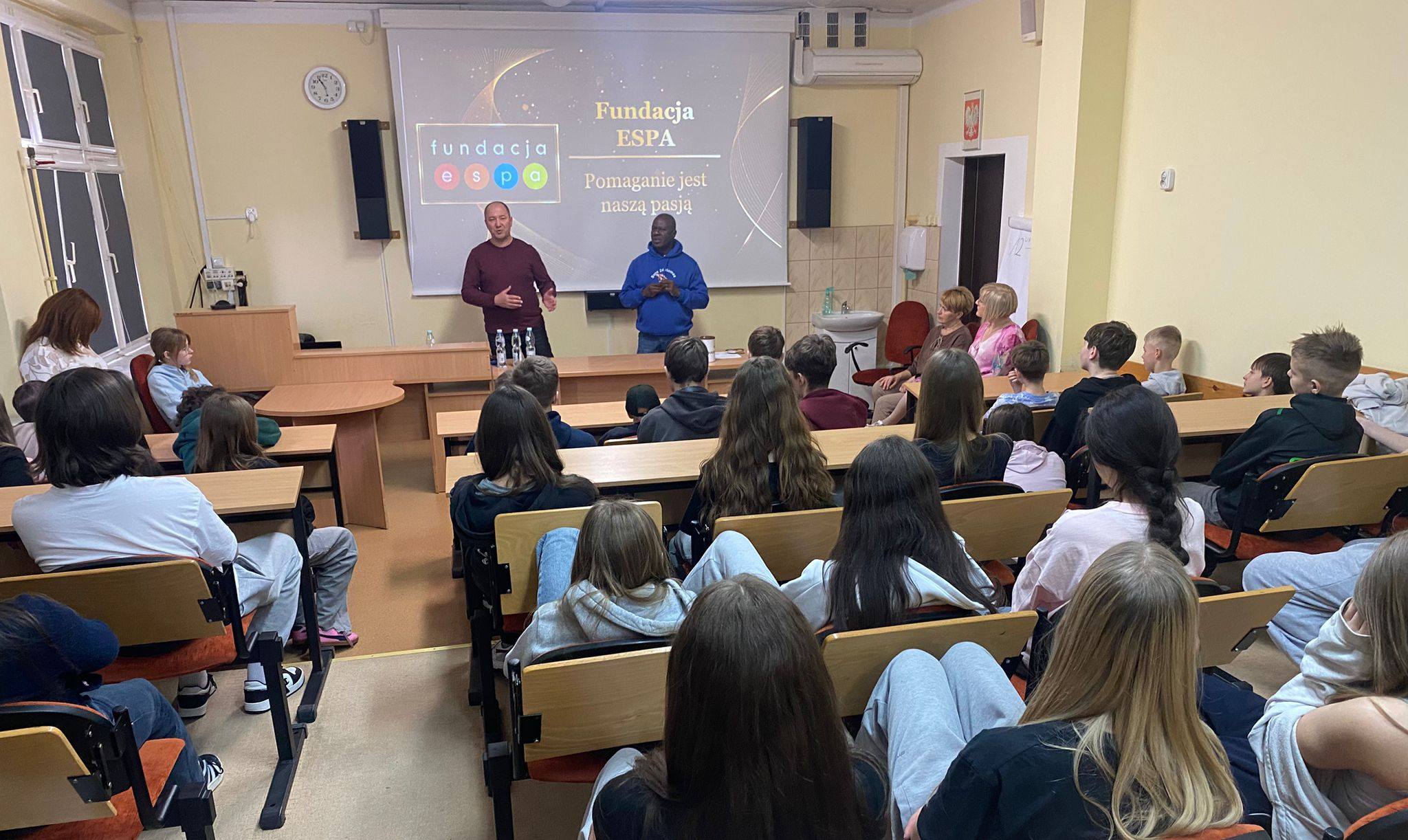 W ramach projektu „Dotykamy ręką świata”, 10 kwietnia odbyło się fantastyczne spotkanie dla uczniów klas V-VIII z gościem z Kenii! Sammy Nawali jest założycielem i dyrektorem Rainedge International Centre – organizacji skoncentrowanej na dzieciach, której celem jest rehabilitacja i wzmacnianie pozycji dzieci znajdujących się w trudnej sytuacji. Urodzony i wychowany przez samotną matkę po rozstaniu rodziców, gdy miał zaledwie dziewięć miesięcy, Sammy doświadczył trudnego dzieciństwa, które doprowadziło go do życia na ulicy w wieku dziewięciu lat. W tym czasie utrzymywał się ze zbieractwa, spał pod gołym niebem i zmagał się z uzależnieniem od substancji aż do trzynastego roku życia. Jego życie zmieniło się, gdy poznał turystę, który pomógł mu wrócić do szkoły. Dzięki determinacji i wytrwałości ukończył zarówno szkołę podstawową, jak i średnią, a później wyjechał do Szkocji. Tam pracował dorywczo, a po powrocie do Kenii założył własną firmę z branży nieruchomości. Mimo odniesionego sukcesu Sammy odczuwał silną potrzebę pomagania dzieciom, które przeżywają podobne trudności jak te, których sam doświadczył. Po udzieleniu pomocy jednemu chłopcu w potrzebie, zaczął przyjmować pod swoje skrzydła kolejne dzieci, zapewniając im schronienie i opiekę. Inicjatywa ta przekształciła się w zorganizowane działania obejmujące zapisywanie dzieci do szkół z internatem, uruchomienie programu dożywiania oraz stworzenie ośrodka rehabilitacyjnego, którego celem jest ratowanie chłopców z życia na ulicy, wspieranie ich w wychodzeniu z uzależnień oraz zapewnienie dostępu do edukacji, żywności, odzieży i bezpiecznego schronienia. Dziś Sammy Nawali kieruje się misją zmieniania życia innych, dając potrzebującym dzieciom nadzieję, godność i drugą szansę na lepsze życie.