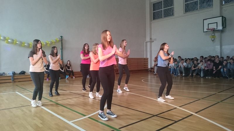 Jako pierwsze wystąpiły dziewczyny z klasy IIIA, IIA, IIE oraz z IB prezentując „Skrzypka”. Potem mogliśmy oglądać dziewczyny z klasy IIB w układzie na stepach. Z kolei parkietem zawładnęły uczennice z IIA tańcząc do piosenki „Waka, waka”. O tym ,że tańczyć mogą nie tylko dziewczyny przekonała nas klasa IIIA wykonując najbardziej popularny w naszej szkole taniec belgijski. Potem przyszła pora na wspólną zabawę przy utworze „Hey baby” . Dynamiczny i żywiołowy rock and roll zaprezentowały uczennice z klasy IA. Z kolei dziewczyny z klasy IIE i IB połączyły swoje siły i oczarowały nas układem do piosenki „Uptown funk”. Zwieńczeniem pokazów była wspólnie odtańczona „Belgija”– ledwo udało się wszystkim pomieścić.