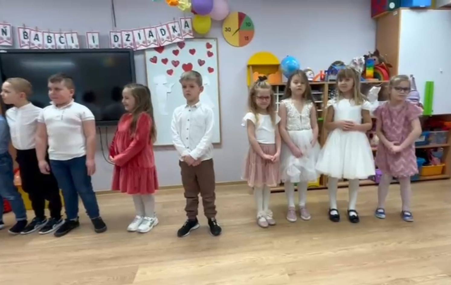 Do naszego przedszkola zawitali wyjątkowi goście – ukochane babcie i dziadkowie. Spotkanie upłynęło w radosnej i pełnej śmiechu atmosferze. Babcie i Dziadkowie z wielkim zaangażowaniem wzięli udział w przygotowanych konkurencjach. Jedną z nich było przyszywanie guzików – tu liczyła się precyzja i cierpliwość. Nie zabrakło też wyzwania artystycznego, czyli malowania z zamkniętymi oczami, które dostarczyło wszystkim mnóstwo zabawy i zaskakujących „dzieł sztuki”. To był piękny czas wspólnej integracji, rozmów i budowania międzypokoleniowych więzi.