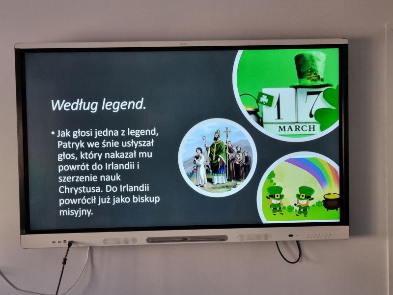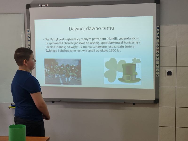 17 marca przypada dzień Św. Patryka – narodowe i religijne święto Irlandii. Dzięki hucznym i zielonym tradycjom znane i obchodzone jest na całym świecie. Uczniowie naszej szkoły przygotowali z tej okazji ciekawe prezentacje multimedialne, w których rozbrzmiewała muzyka irlandzka i można było obejrzeć oryginalny taniec irlandzki. Podczas zajęć języka angielskiego uczniowie mogli także sprawdzić swoją wiedzę na temat Irlandii oraz zwyczajów obchodzenia dnia Św. Patryka na świecie, rozwiązując quizy multimedialne. Sale oraz tablice zostały ozdobione zieloną koniczyną, zwaną shamrock. W tym dniu mile widziane były stroje w barwach zielonych.