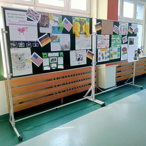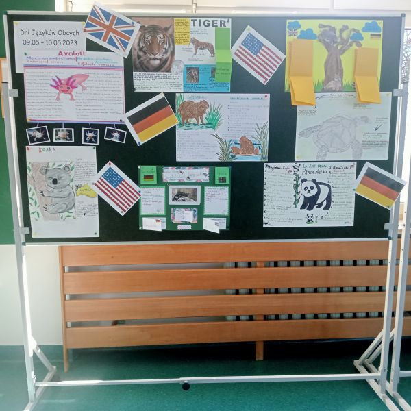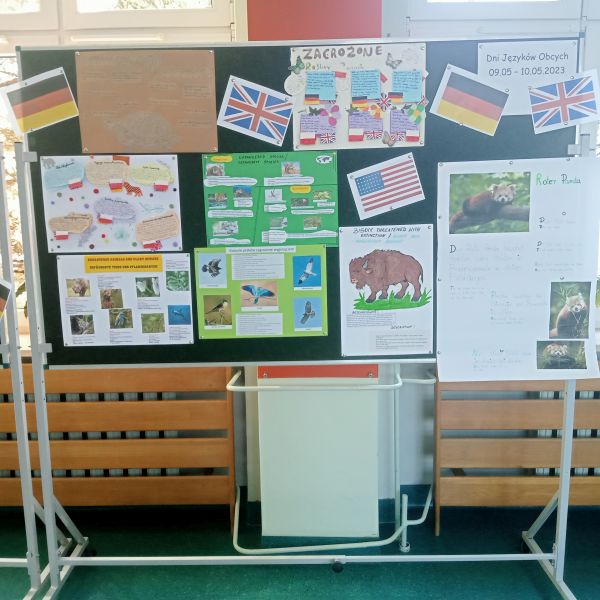 - kl. 4 i 5 - plakaty w dwóch językach (po angielsku i po niemiecku) przedstawiające zagrożone gatunki roślin i zwierząt,