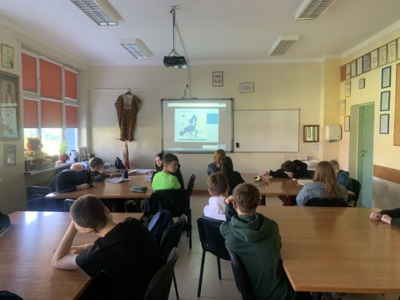 W maju uczniowie klas VIII uczestniczyli w zajęciach online przygotowanych przez pracowników Domu Europy we Wrocławiu. Młodzież poszerzyła swoje wiadomości na temat UE poprzez prelekcje „Unia Europejska w pigułce” oraz „Polacy w Unii Europejskiej”.