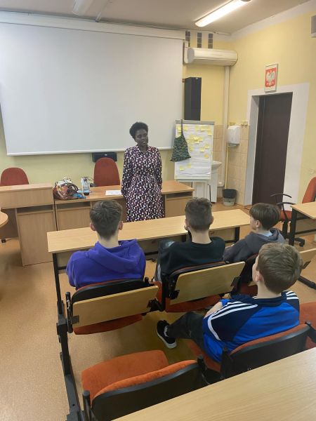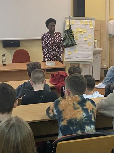 Poprzez czas spędzony z Jacqulune Ingabire - Mimi młodzież klas 7 i 8 mogła usłyszeć piękną, choć trudną historię życia uchodźcy z Ruandy, dla której Polska stała się drugą ojczyzną… Uczniowie też mogli bardziej zrozumieć, jaką wartością jest życie w wolnym kraju oraz pogłębić szacunek do drugiego człowieka bez względu na rasę, kulturę, religię …