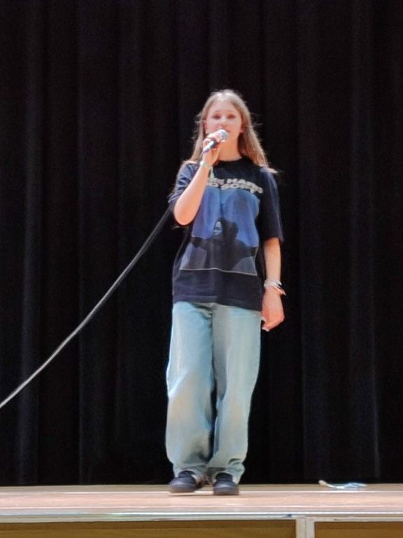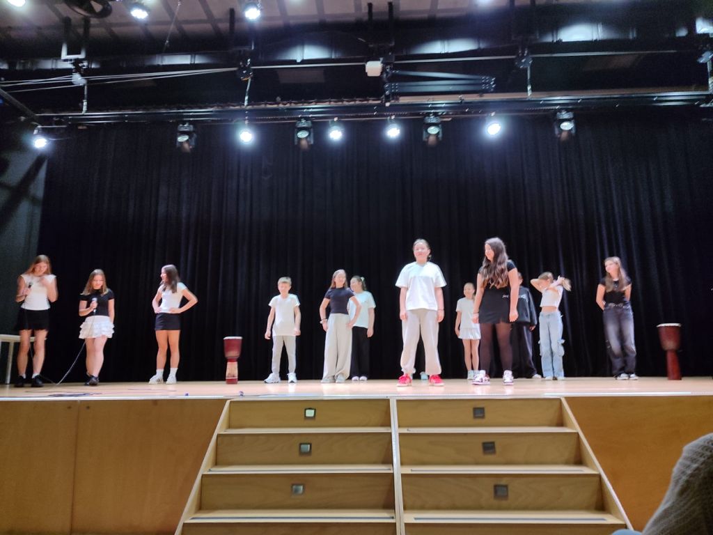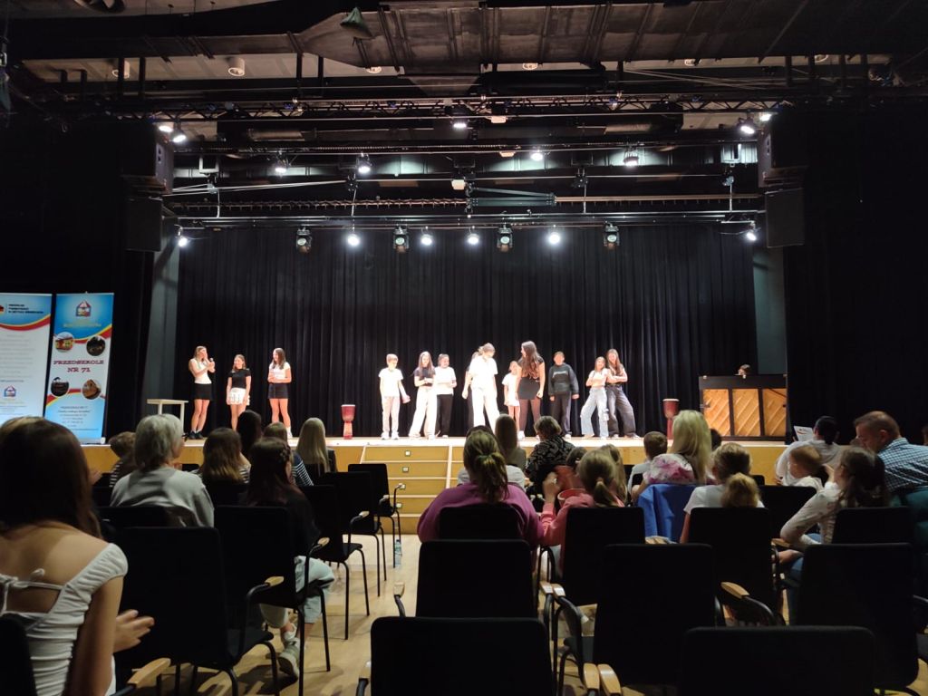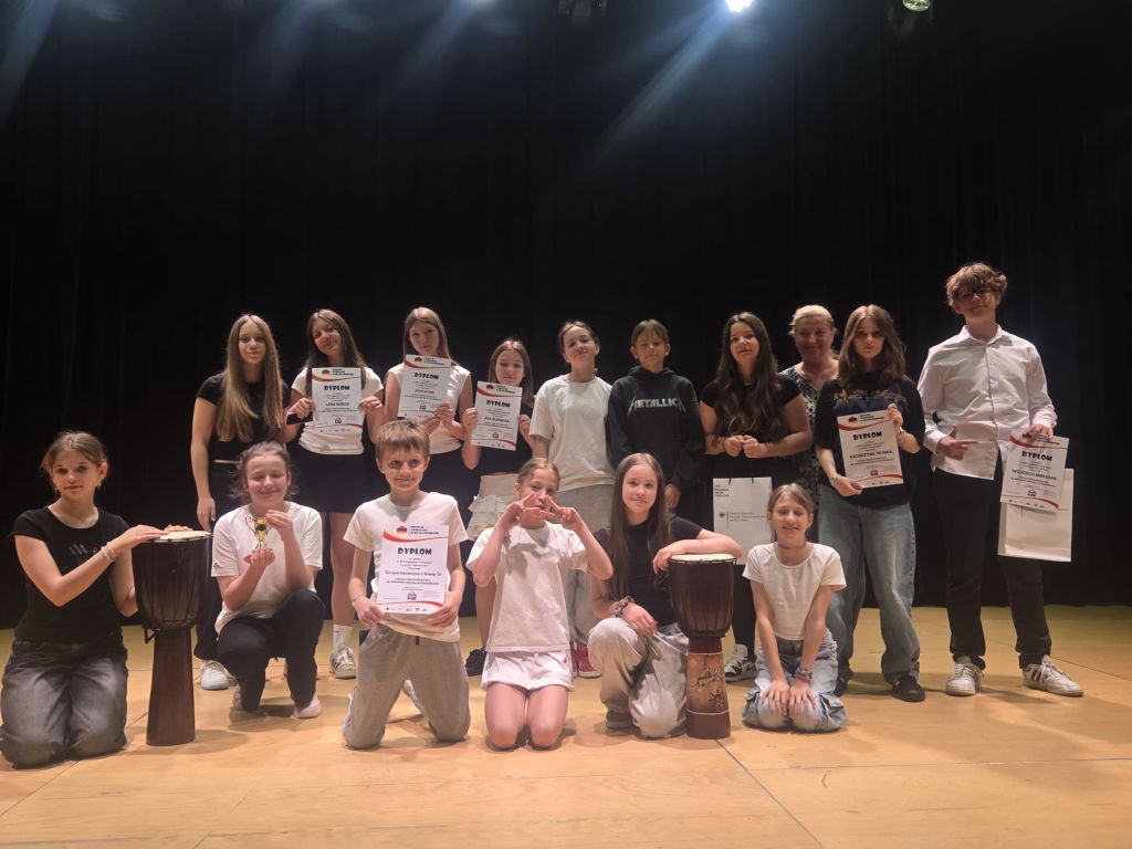 22 maja 2025 r. w Centrum Biblioteczno-Kulturalnym FAMA we Wrocławiu odbył się XI Przegląd Twórczości w Języku Niemieckim. W ponad 20 występach uczestnicy licznych placówek oświatowych województwa dolnośląskiego prezentowali swoje talenty śpiewając, recytując wiersze, opowiadając bajki i przedstawiając krótkie formy teatralne w j. niemieckim. Naszą szkołę prezentowali: Katarzyna Trybka śpiewając piosenkę „Durch den Monsun” zespołu Tokio Hotel, Wojciech Miękisiak recytując wiersz J. Wolfganga von Goethe „ Gefunden” oraz Lena Babisz, Julia Kisiel i Ada Rudnicka wykonując utwór „Kuma he” zespołu Wir 3 do którego żywiołową aranżację taneczną opracowała samodzielnie i wykonała grupa uczniów z klasy Vc. Wszyscy uczestnicy otrzymali pamiątkowe dyplomy i drobne upominki. Opiekę nad uczniami w trakcie Przeglądu sprawowały Pani Justyna Trybka i Sylwia Juszczak. Dziękujemy Pani Joannie Kący za wypożyczenie instrumentów i cenne uwagi udzielone grupie tanecznej z klasy Vc, Dyrekcji naszej szkoły za umożliwienie nam kolejny raz udziału w tym wydarzeniu, a rodzicom występujących uczniów za życzliwość i wsparcie.