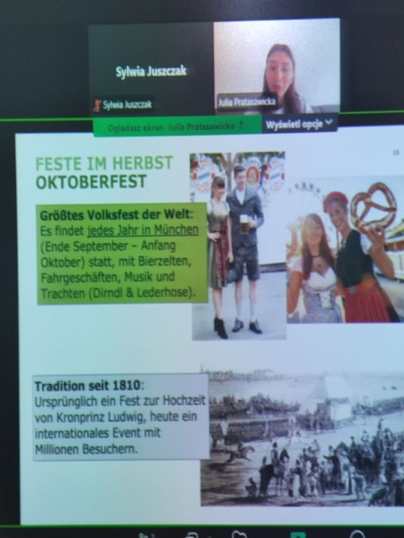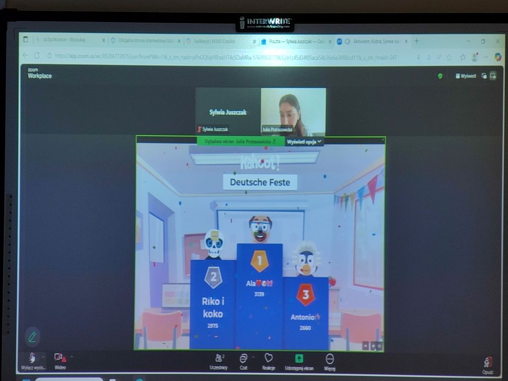 20 października 2025 roku grupa naszych uczniów uczestniczyła w warsztatach online z Kübrą, wolontariuszką Instytutu Goethego w Warszawie, w ramach programu Deutsch Plus. Kübra, w oparciu o przygotowaną przez siebie prezentację, opowiadała uczniom o świętach i tradycjach ludowych obchodzonych w Niemczech. Po prezentacji uczniowie sprawdzili zdobytą wiedzę grając w Kahoota. I miejsce zdobyła Alicja Kurnicka z klasy V c, II miejsce Gracjan Kukla i Antoni Chmiel z klasy V c, a III miejsce Antoni Siemaszko z klasy VI c. Na koniec warsztatów uczniowie zadawali prowadzącej pytania. Dowiedzieli się, że Kübra włada 4 językami, lubi makaron i jeszcze nie była w Polsce, ale planuje przyjechać do naszego kraju z przyjaciółmi. Dziękujemy Kübrze za spotkanie, a zwycięzcom Kahoota gratulujemy sukcesu.